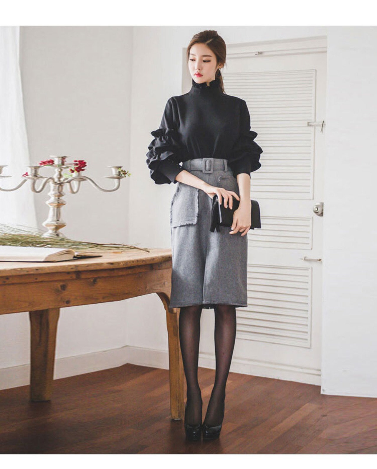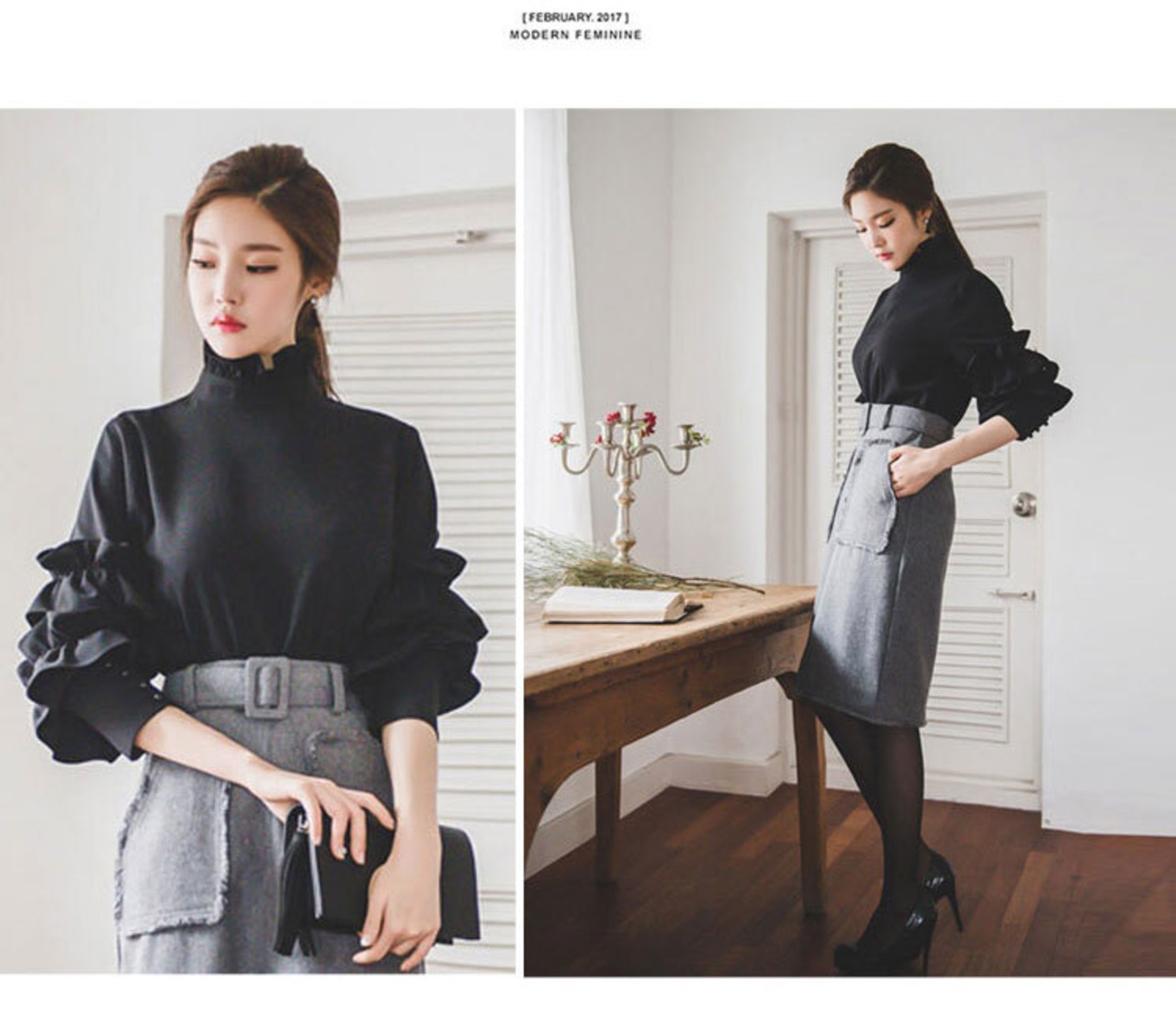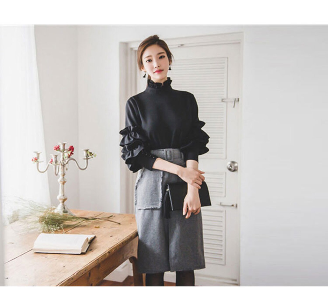 襟元や袖のフリルが可愛らしいタートルネックブラウス。