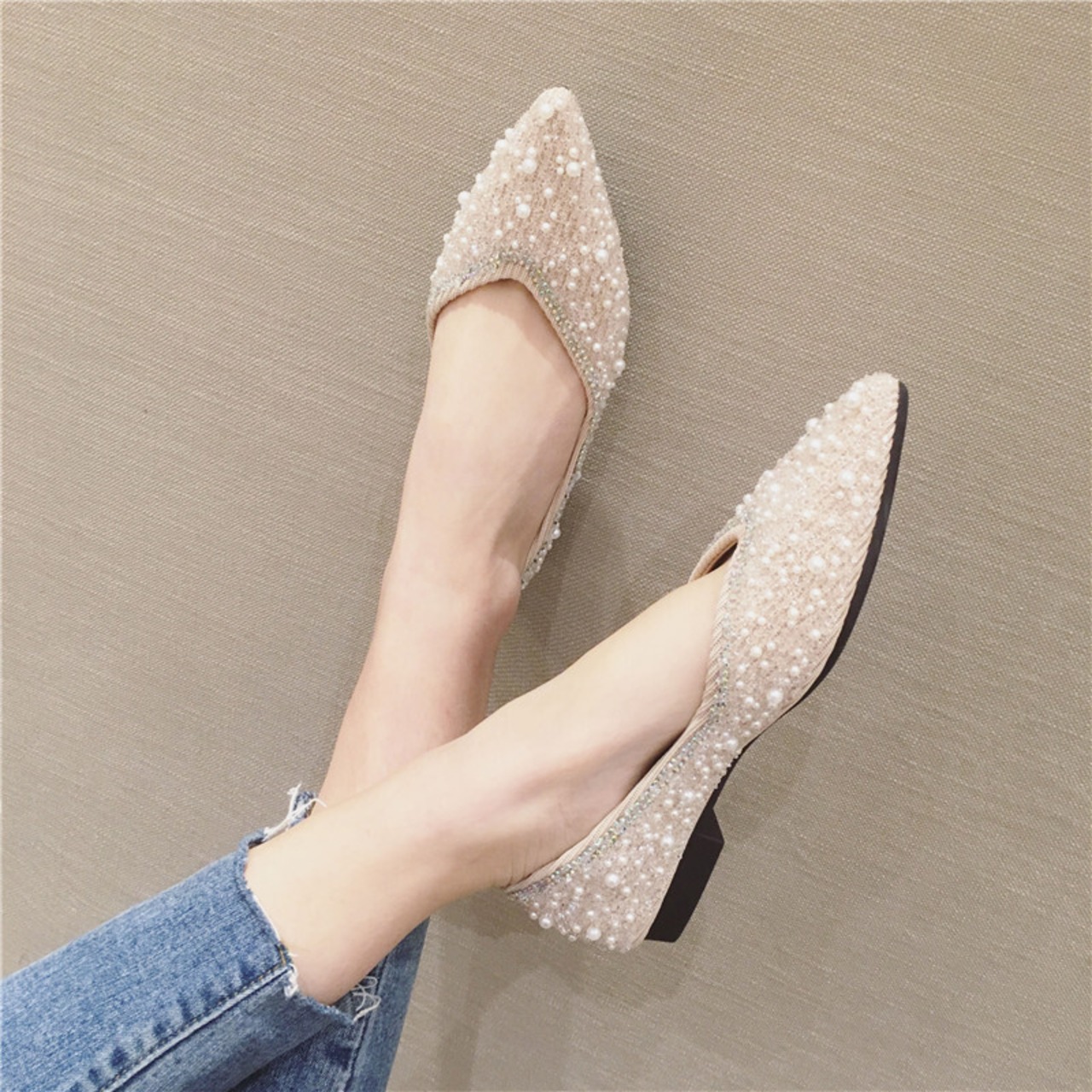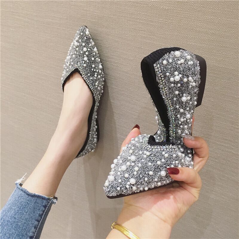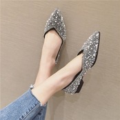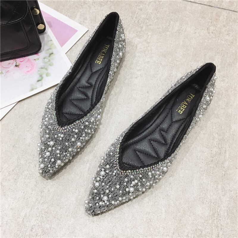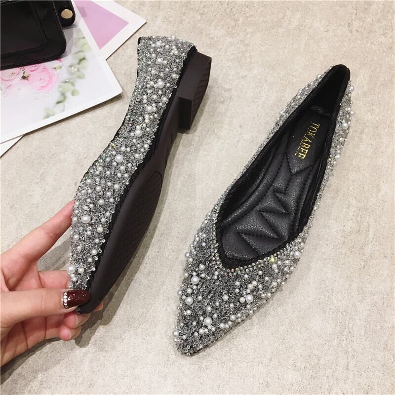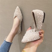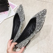 サイズ展開豊富なビジューのついたおしゃれなフラットパンプスです。