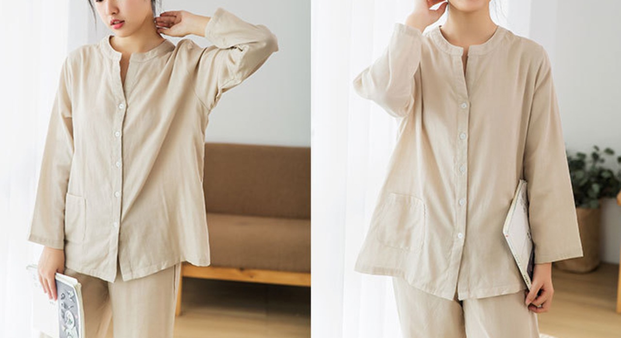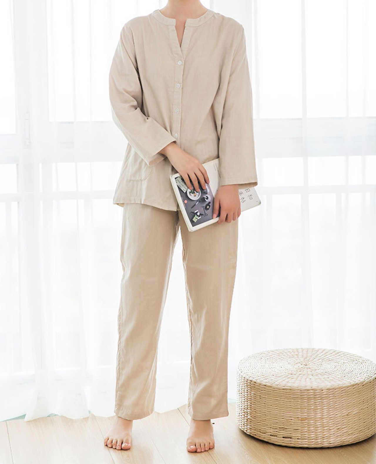 ルームウェア パジャマ 上下セット 寝巻き ナイトウェア 入院 長袖 スキッパー 前開き ウエストゴム ダブルガーゼ 無地 シンプル カジュアル 上品 ラフ ゆったり ナチュラル ベーシック オールシーズン 10代 20代 30代 40代 50代 レディース お泊まり 入院中 お風呂上がり 楽ちん リラックス ベージュ