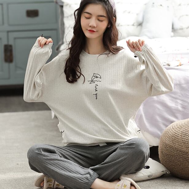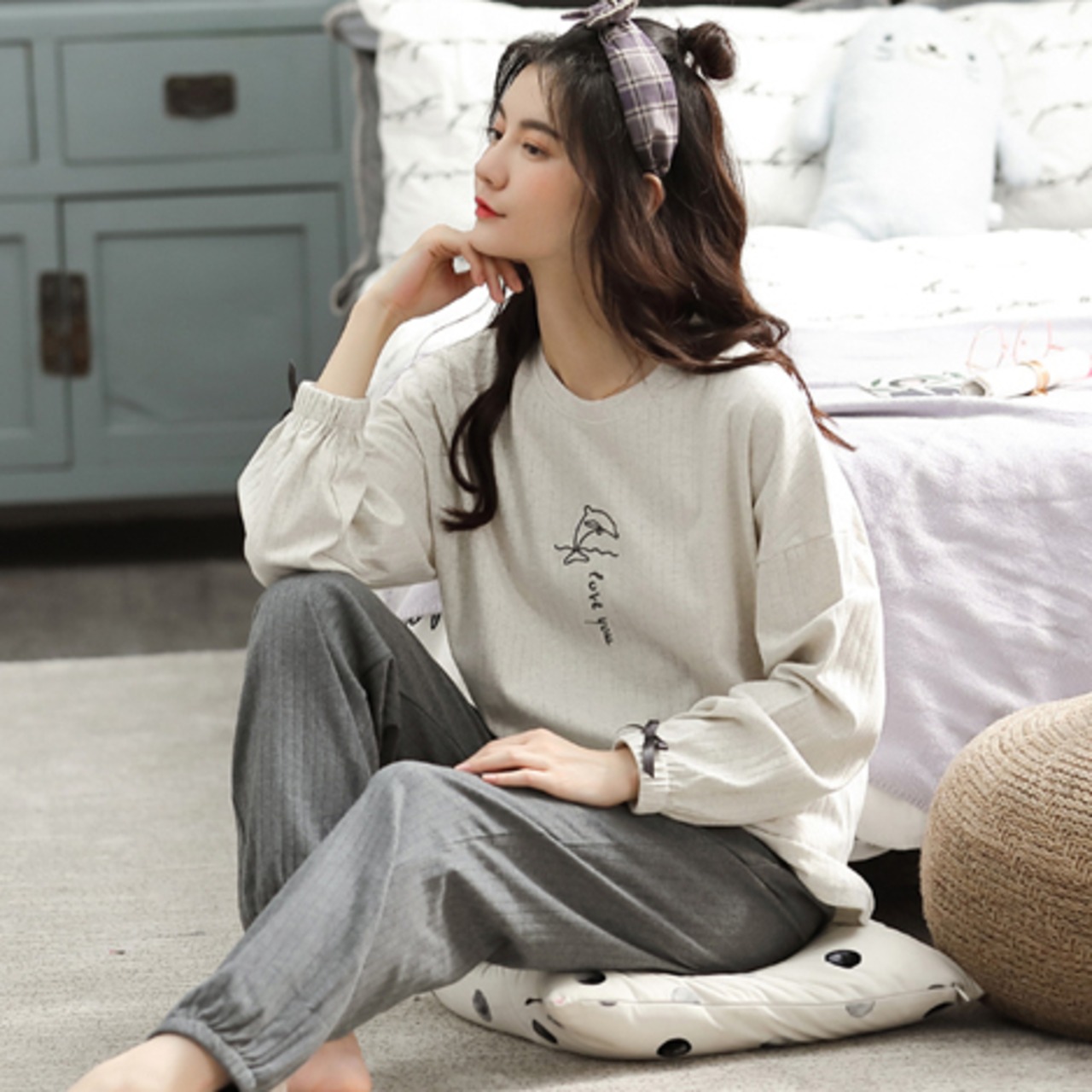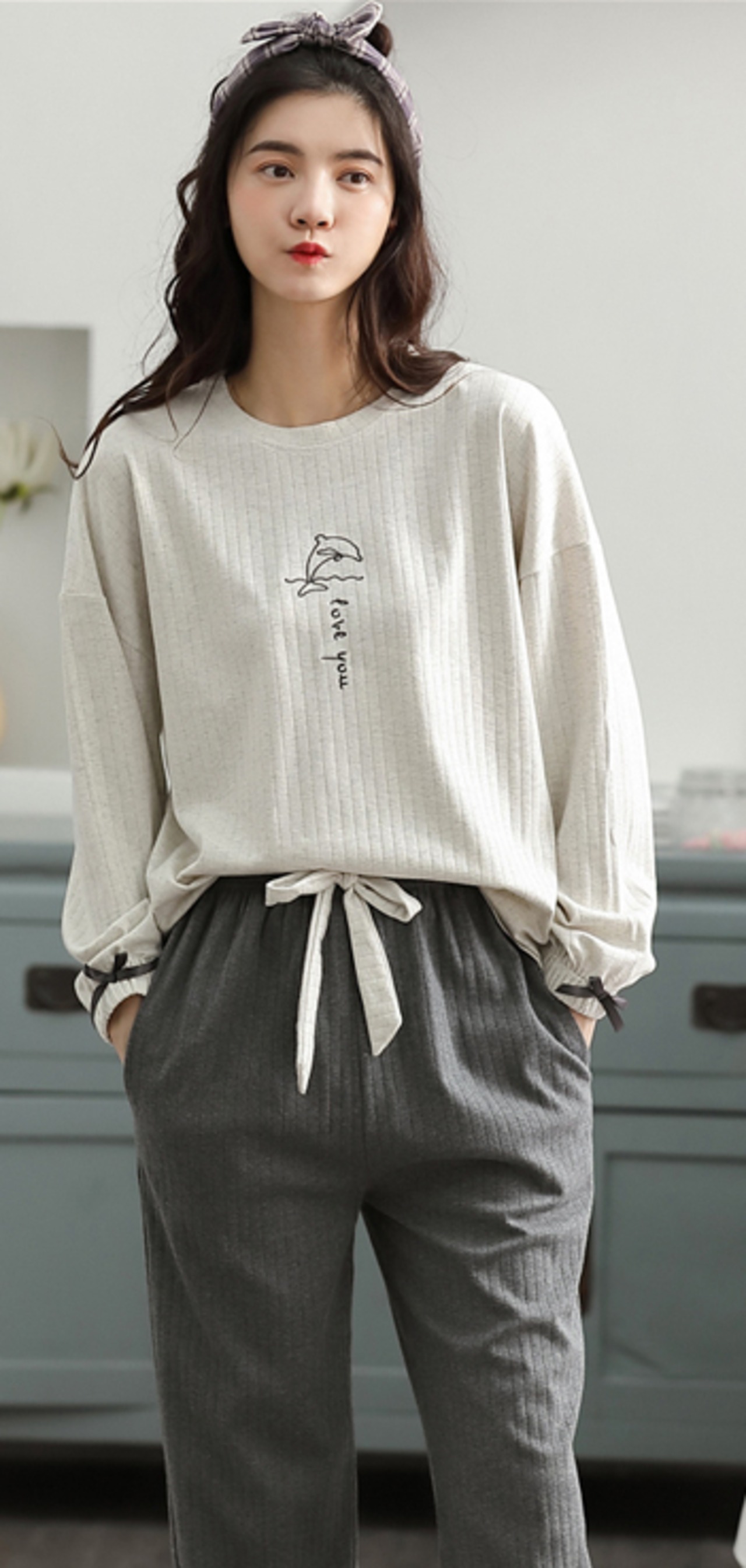 ルームウェア パジャマ 上下セット 部屋着 寝巻き ナイトウェア 長袖 ラウンドネック プルオーバー リボン ポケット ウエストゴム リブ 伸縮性 大きめサイズ 綿 イルカ 大人可愛い シンプル カジュアル ラフ キュート 抜け感 ゆったり ナチュラル 春 夏 秋 10代 20代 30代 40代 レディース お泊まり 休日 楽ちん リラックス 大人カラー