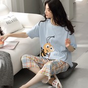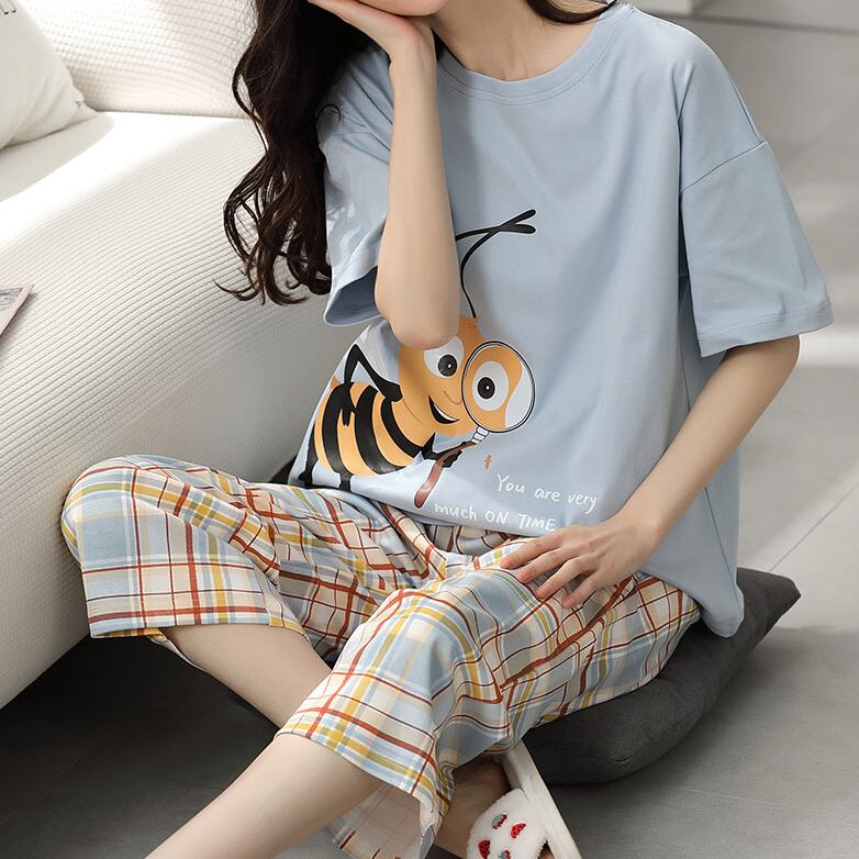 ルームウェア パジャマ 上下セット 部屋着 寝巻き ナイトウェア 半袖 ラウンドネック クロップド丈 ウエストゴム ハチ 大人可愛い シンプル カジュアル ラフ キュート ゆったり 夏 10代 20代 30代 レディース 学生 お泊まり 休日 運動 楽ちん リラックス