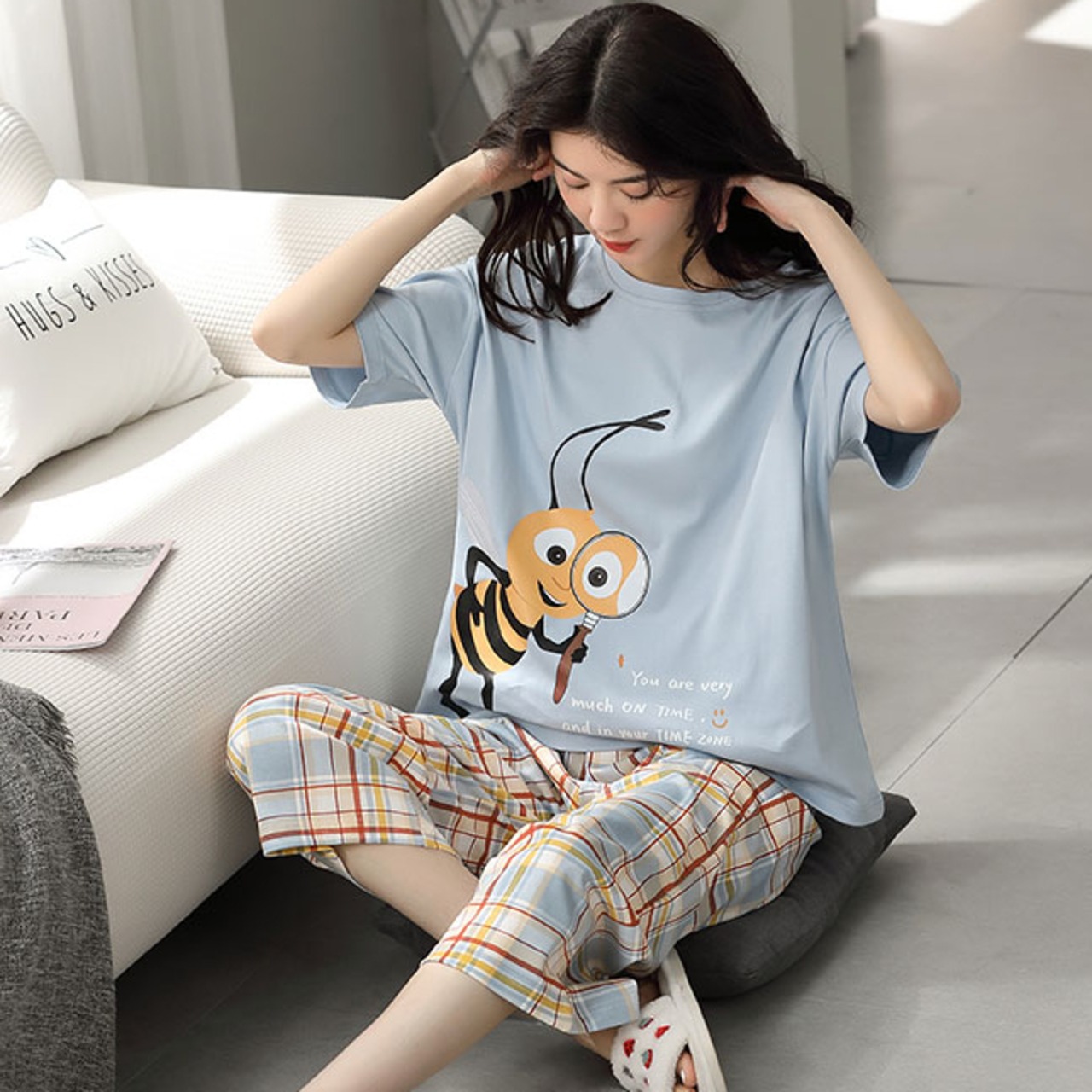 可愛い半袖Tシャツ&チェック柄のクロップドパンツで、リラックスタイムも爽やかに過ごせそう♪