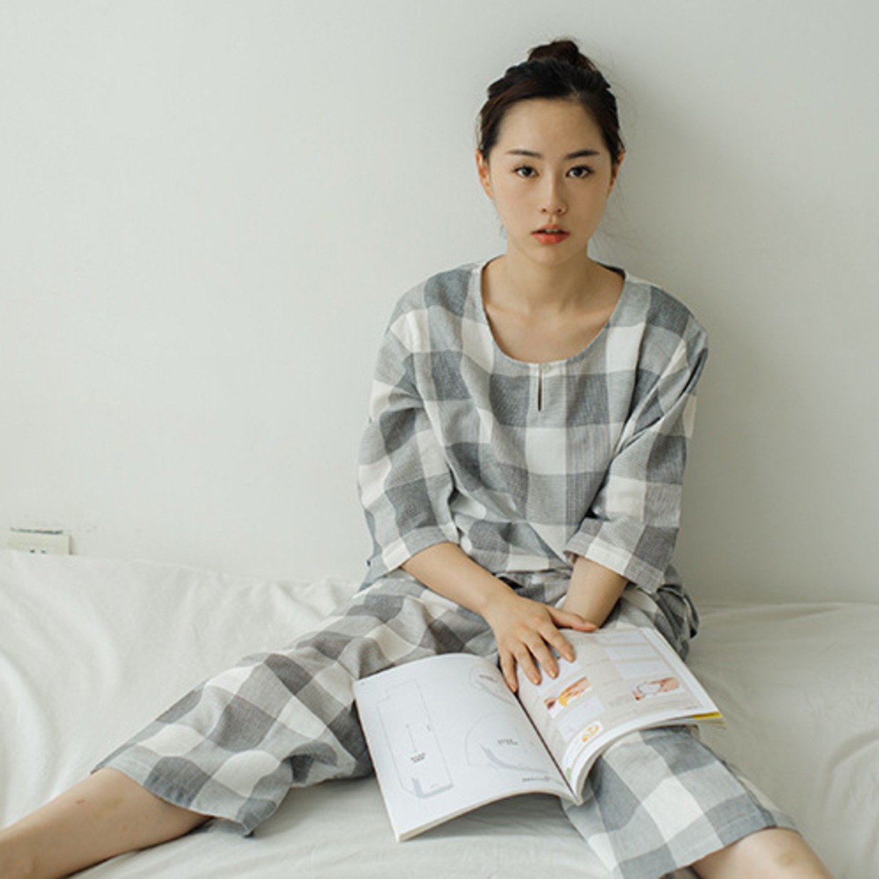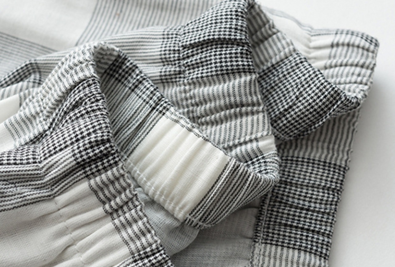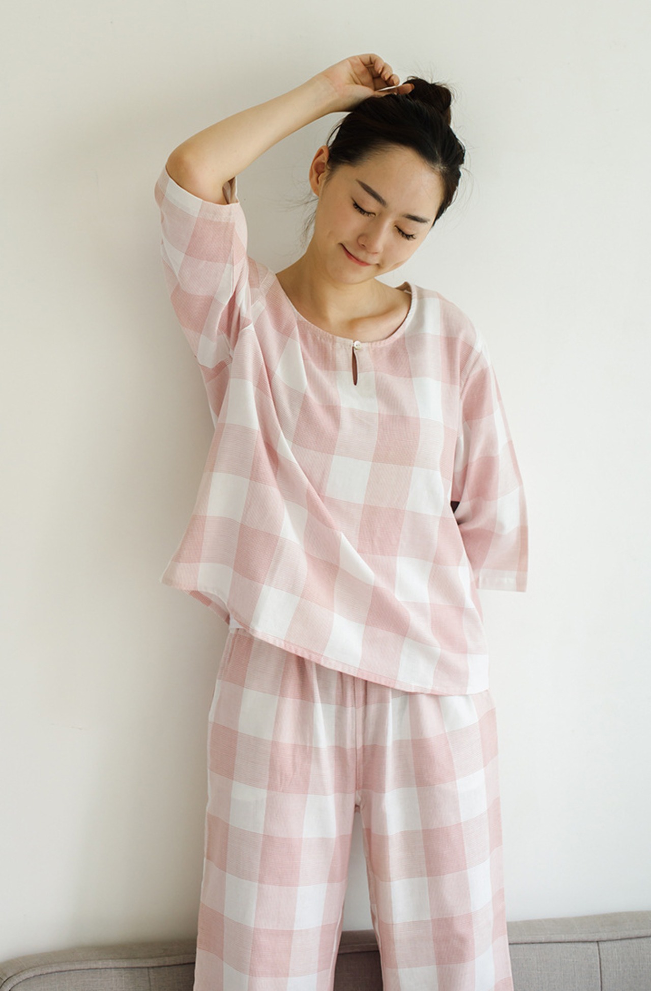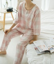 プルオーバータイプのチェック柄ルームウェア上下セットです。