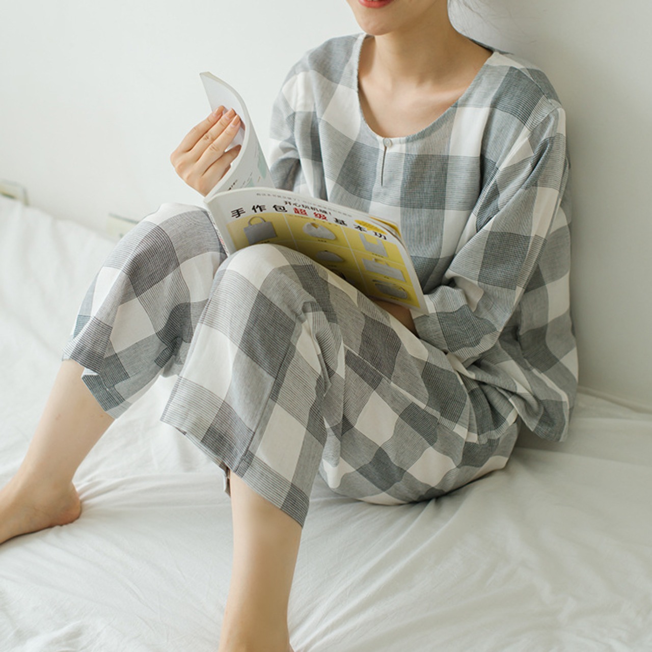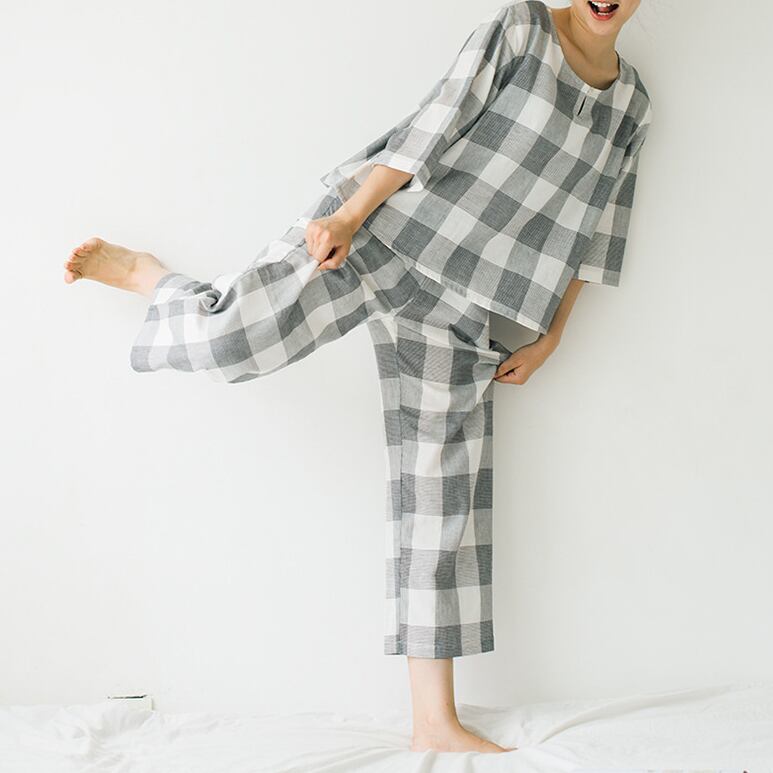 ルームウェア パジャマ 上下セット 部屋着 寝巻き ナイトウェア 七分袖 プルオーバー スリットネック ウエストゴム チェック柄 かわいい 大人可愛い きれいめ シンプル カジュアル 上品 大人カジュアル 大人女子 抜け感 ゆったり ナチュラル 春 夏 10代 20代 30代 40代 50代 レディース お泊まり 休日 楽ちん リラックス 定番 グレー オレンジ ニュアンスカラー