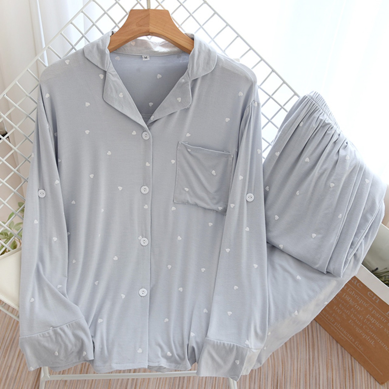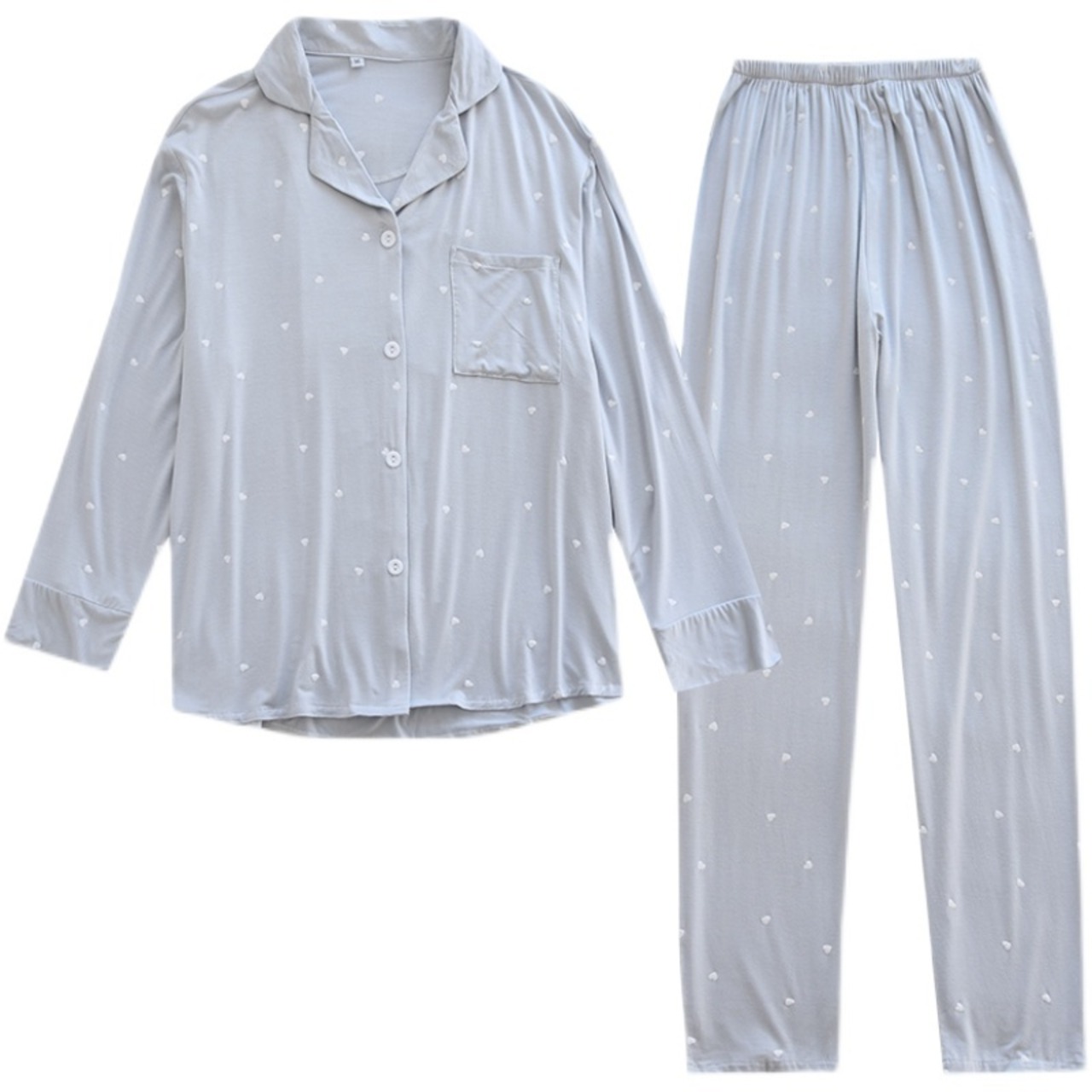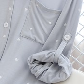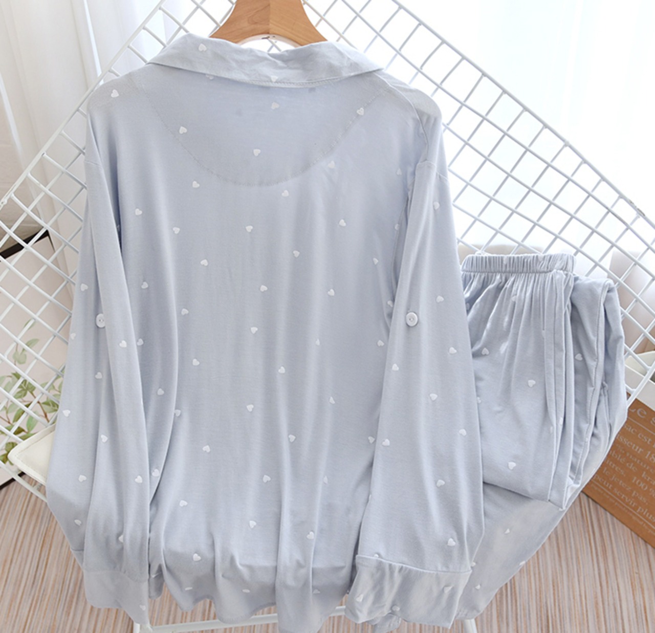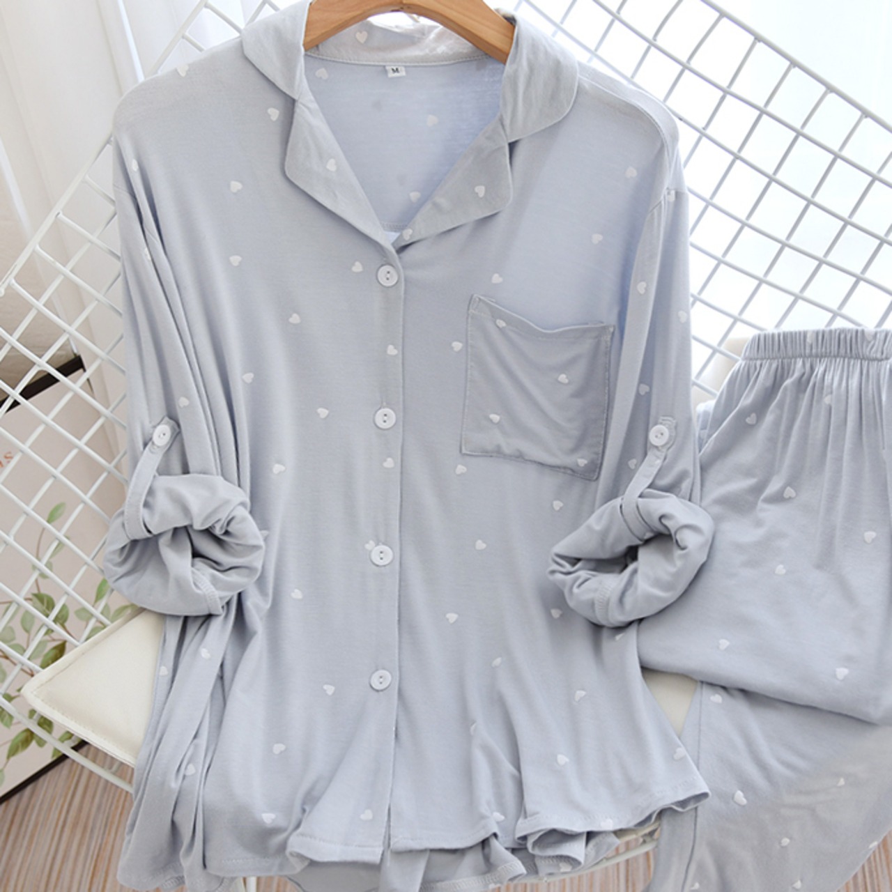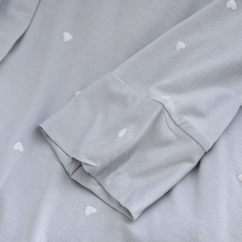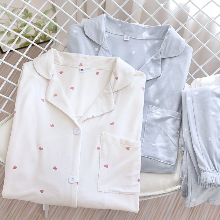 ルームウェア パジャマ 上下セット 部屋着 寝巻き ナイトウェア 長袖 ロールアップボタン付き 襟付き 前開き ハート柄 かわいい 大人可愛い カジュアル 大人女子 ラブリー キュート ガーリー ゆったり ナチュラル スイート 春 秋 10代 20代 30代 40代 レディース 入院準備 お泊まり 休日 入院中 楽ちん リラックス ホワイト ブルー ニュアンスカラー