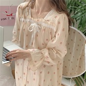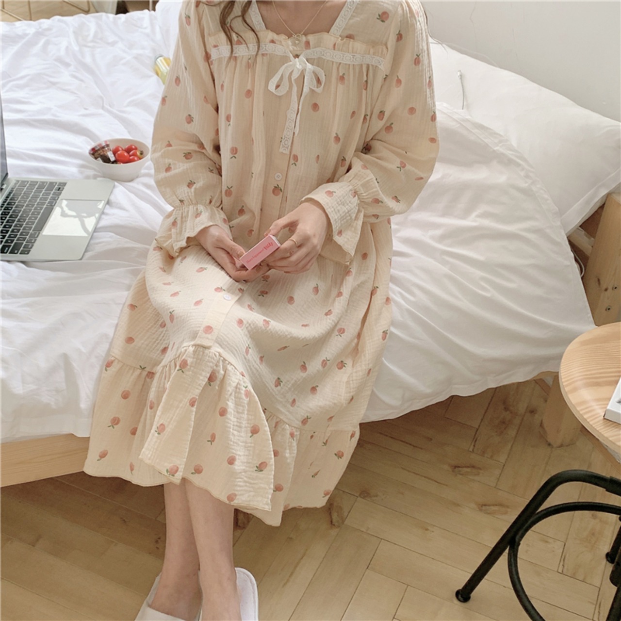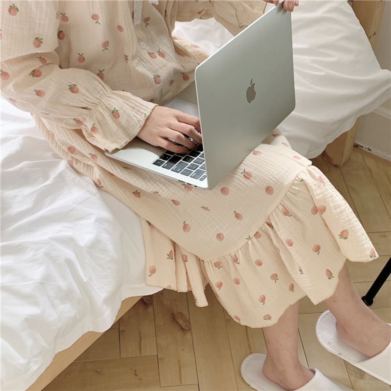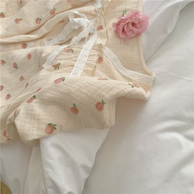 ピーチ柄にレースやリボン、裾のデザインが可愛らしさを引き立てるルームウェアです。