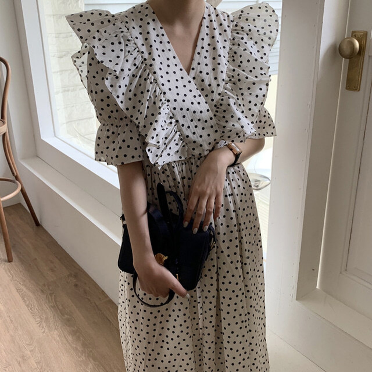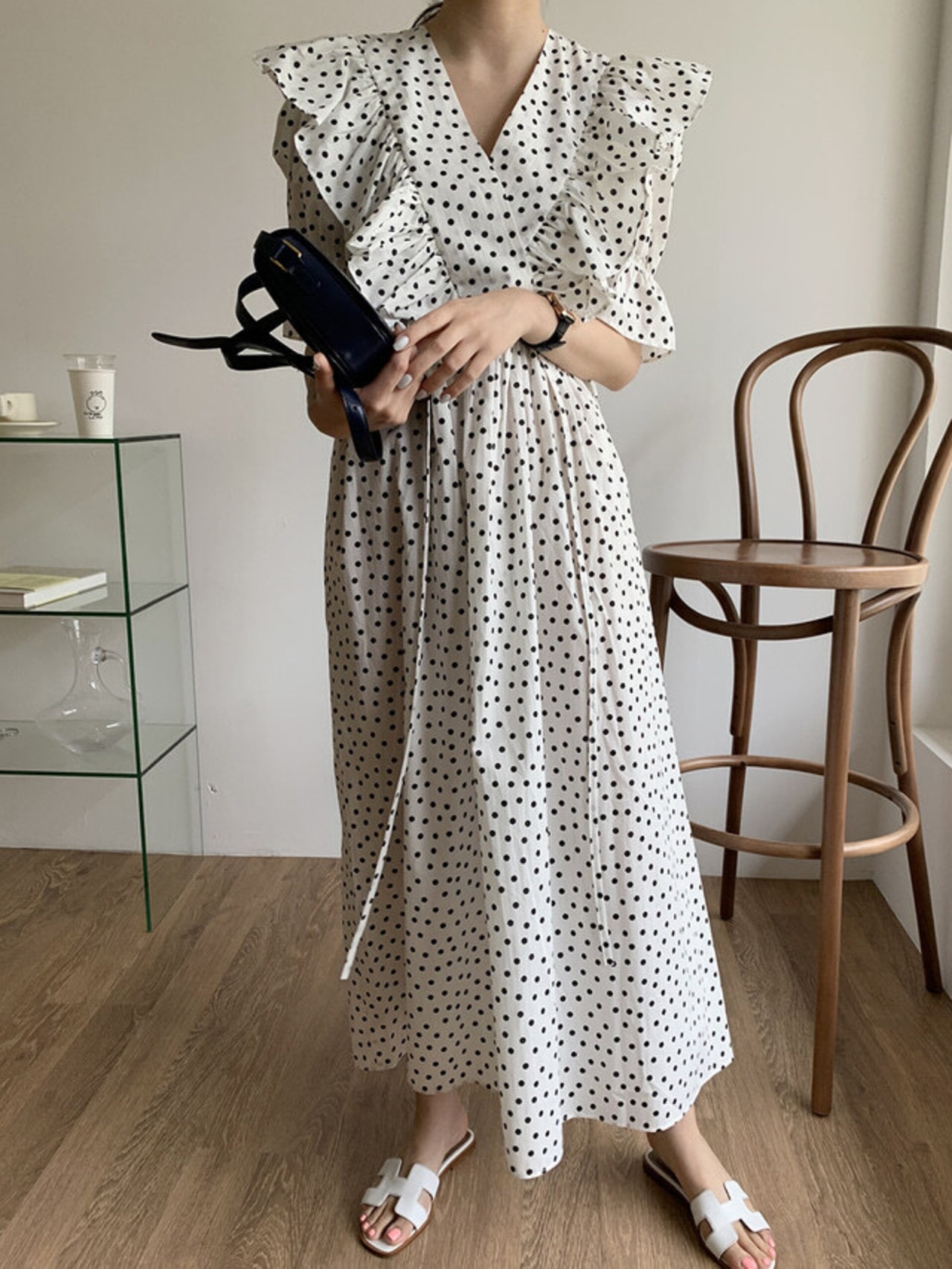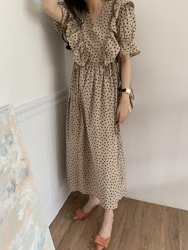 ワンピース フレアワンピース ロング ロング丈 アンクル丈 袖あり 5分袖 パフスリーブ Vネック セミフレア Aライン 大人可愛い 大人 上品 おしゃれ お洒落 大人女子 こなれ感 ラフ ラブリー キュート ガーリー セクシー エレガント 主役級 存在感 とろみ感 抜け感 ドット柄 水玉 春 夏 2022 2023 10代 20代 30代 40代 レディース 女性用 OL 通勤 学生 通学 デート お出かけ 女子会 休日 旅行 ホテル ガーデン レストラン モテ フリーサイズ 白 ホワイト ベージュ