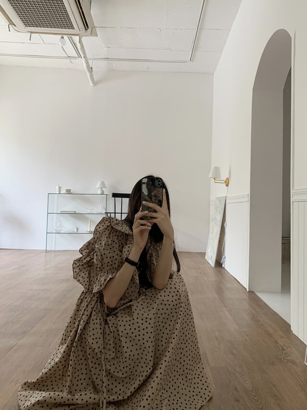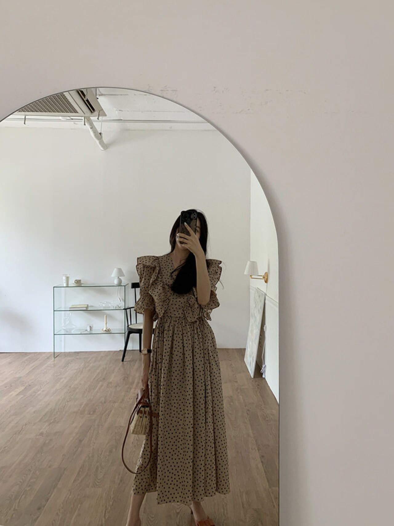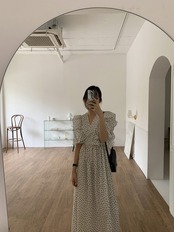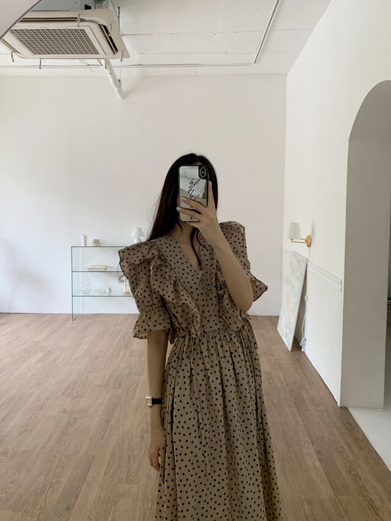 ワンピース フレアワンピース ロング ロング丈 アンクル丈 袖あり 5分袖 パフスリーブ Vネック セミフレア Aライン 大人可愛い 大人 上品 おしゃれ お洒落 大人女子 こなれ感 ラフ ラブリー キュート ガーリー セクシー エレガント 主役級 存在感 とろみ感 抜け感 ドット柄 水玉 春 夏 2022 2023 10代 20代 30代 40代 レディース 女性用 OL 通勤 学生 通学 デート お出かけ 女子会 休日 旅行 ホテル ガーデン レストラン モテ フリーサイズ 白 ホワイト ベージュ