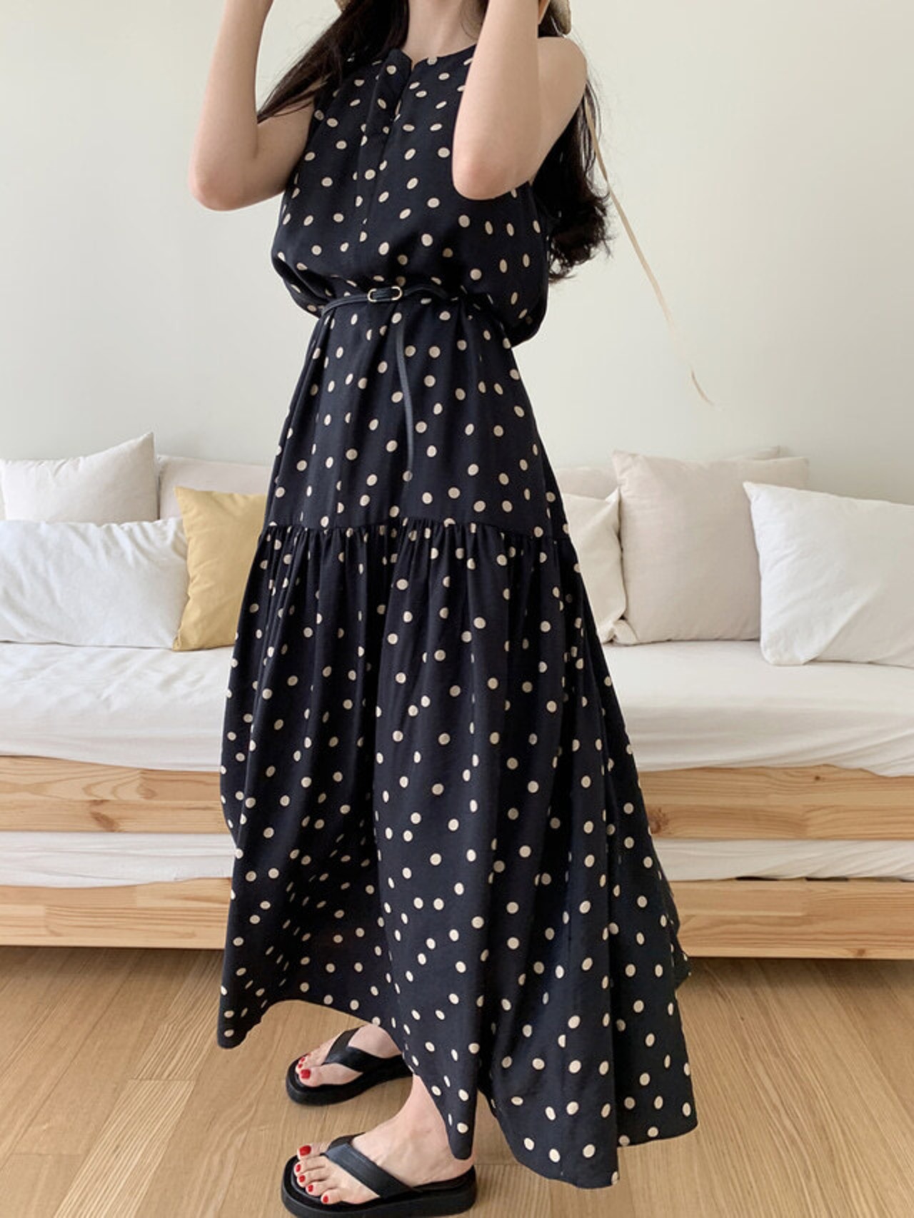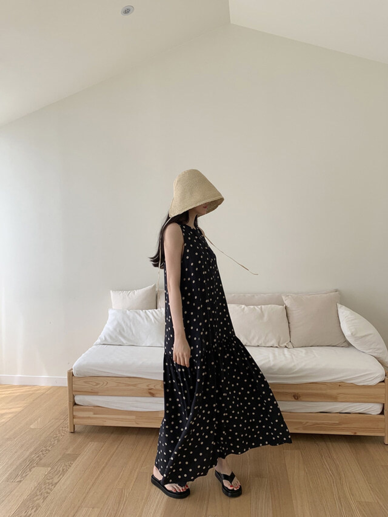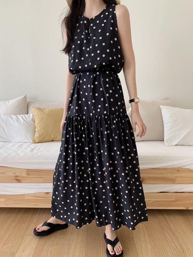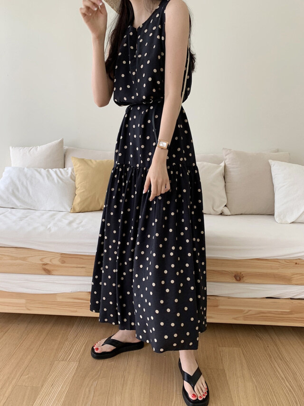 ワンピース フレアワンピース ロング ロング丈 アンクル丈 袖なし ノースリーブ ラウンドネック セミフレア Aライン 大人可愛い 大人 上品 おしゃれ お洒落 大人女子 こなれ感 ラフ ラブリー キュート ガーリー セクシー エレガント 主役級 存在感 とろみ感 抜け感 ドット柄 水玉 春 夏 2022 2023 10代 20代 30代 40代 レディース 女性用 OL 通勤 学生 通学 デート お出かけ 女子会 休日 旅行 ホテル ガーデン レストラン モテ フリーサイズ 黒 ブラック ベージュ