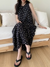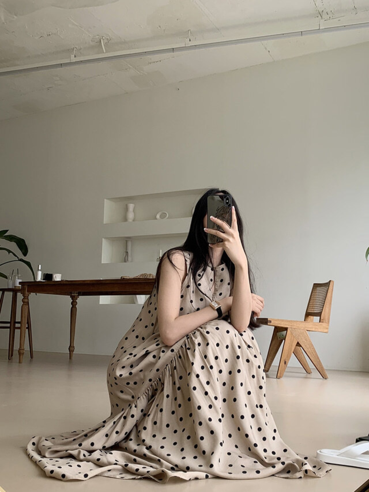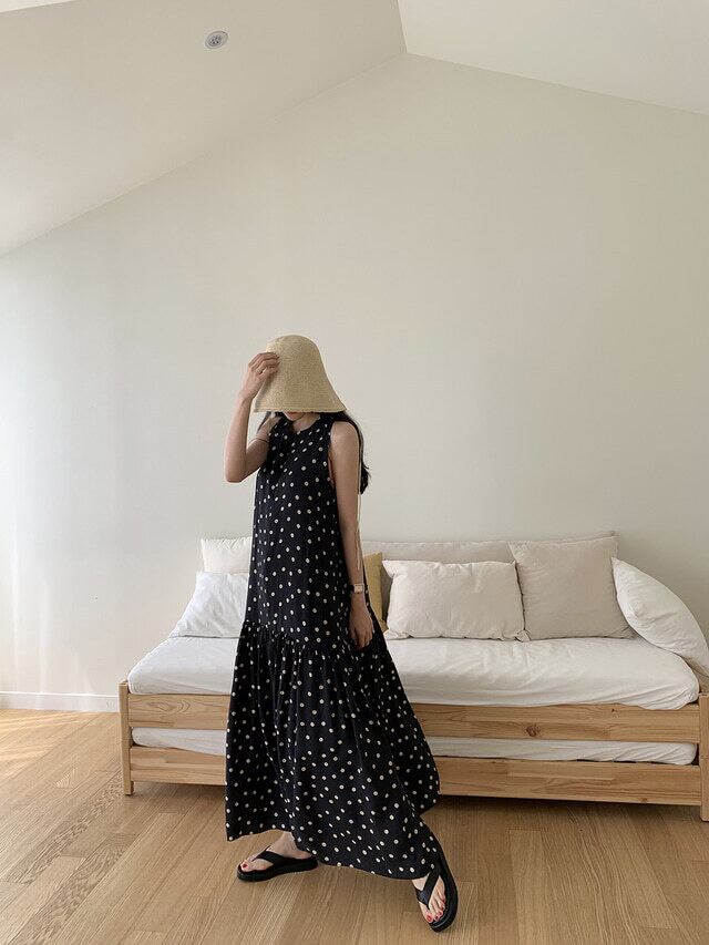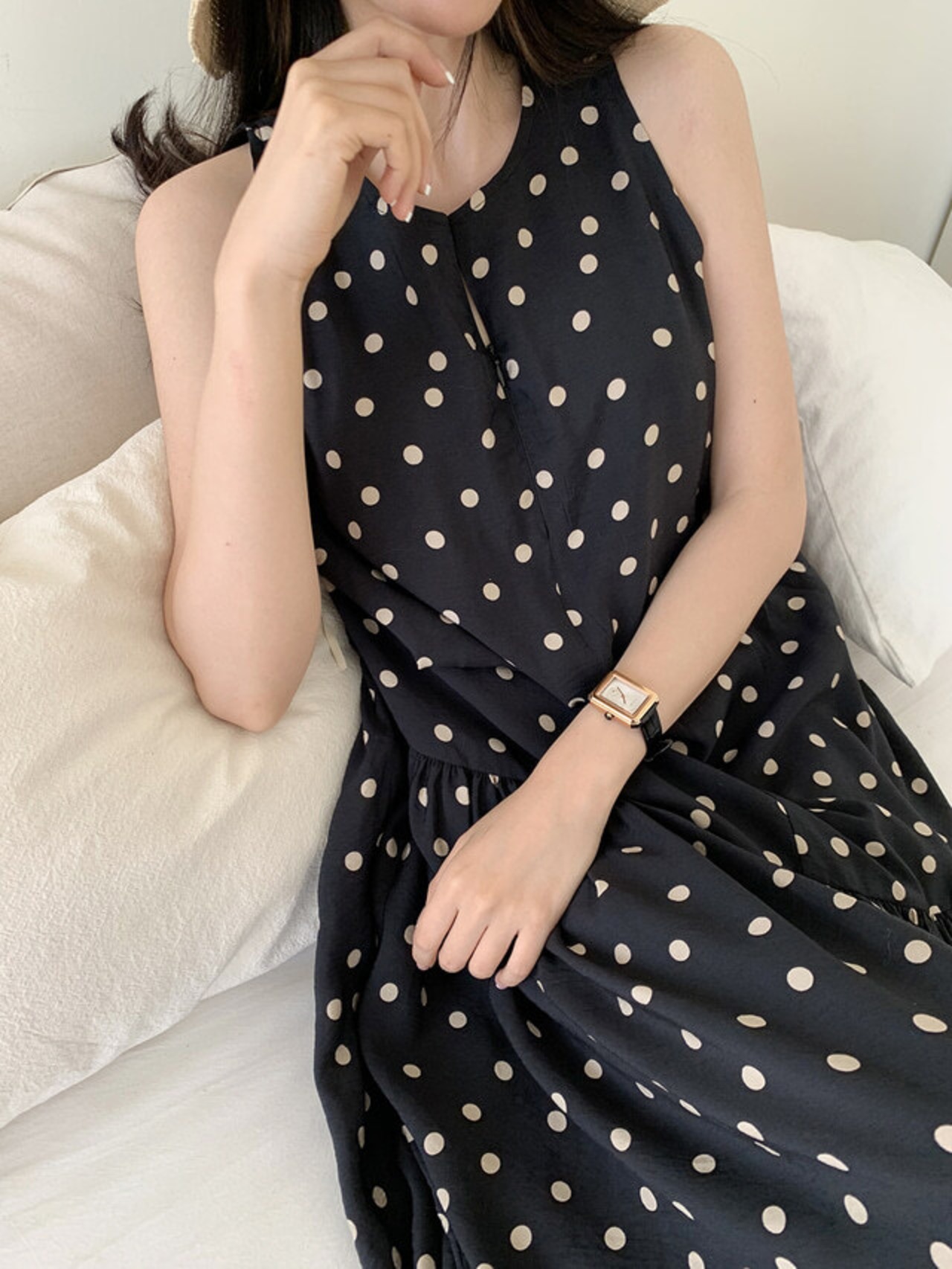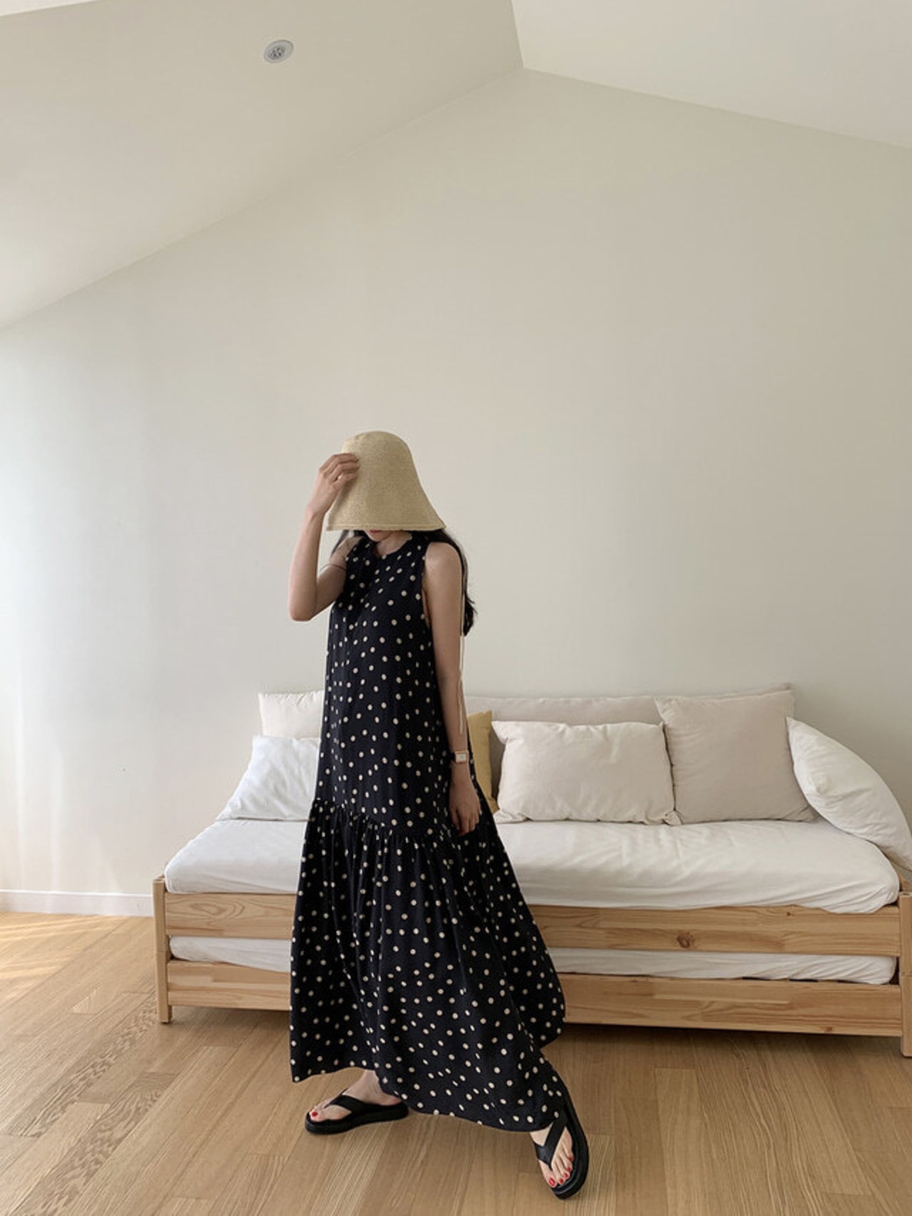 ワンピース フレアワンピース ロング ロング丈 アンクル丈 袖なし ノースリーブ ラウンドネック セミフレア Aライン 大人可愛い 大人 上品 おしゃれ お洒落 大人女子 こなれ感 ラフ ラブリー キュート ガーリー セクシー エレガント 主役級 存在感 とろみ感 抜け感 ドット柄 水玉 春 夏 2022 2023 10代 20代 30代 40代 レディース 女性用 OL 通勤 学生 通学 デート お出かけ 女子会 休日 旅行 ホテル ガーデン レストラン モテ フリーサイズ 黒 ブラック ベージュ