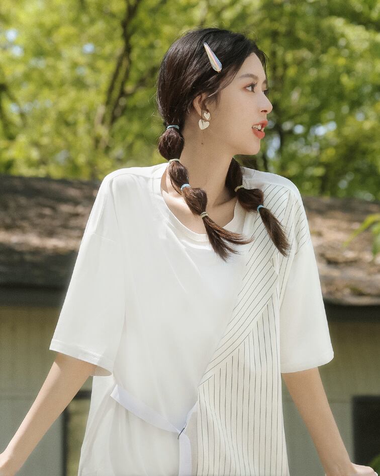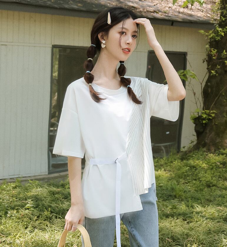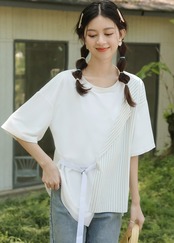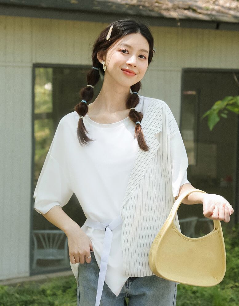 トップス ブラウス カットソー ニットソー 白トップス 袖あり 半袖 ラウンドネック アシンメトリー 切り替えデザイン ドッキング カジュアル 大人 おしゃれ お洒落 かっこいい 大人女子 こなれ感 ラフ 個性的 クール 主役級 存在感 抜け感 無地 ストライプ 春 夏 2022 2023 10代 20代 30代 40代 50代 60代 レディース 女性用 キッズ 女の子 デート お出かけ 女子会 休日 重ね着 コーデ スタイル 楽ちん S M L 白 ホワイト