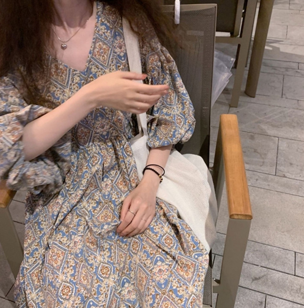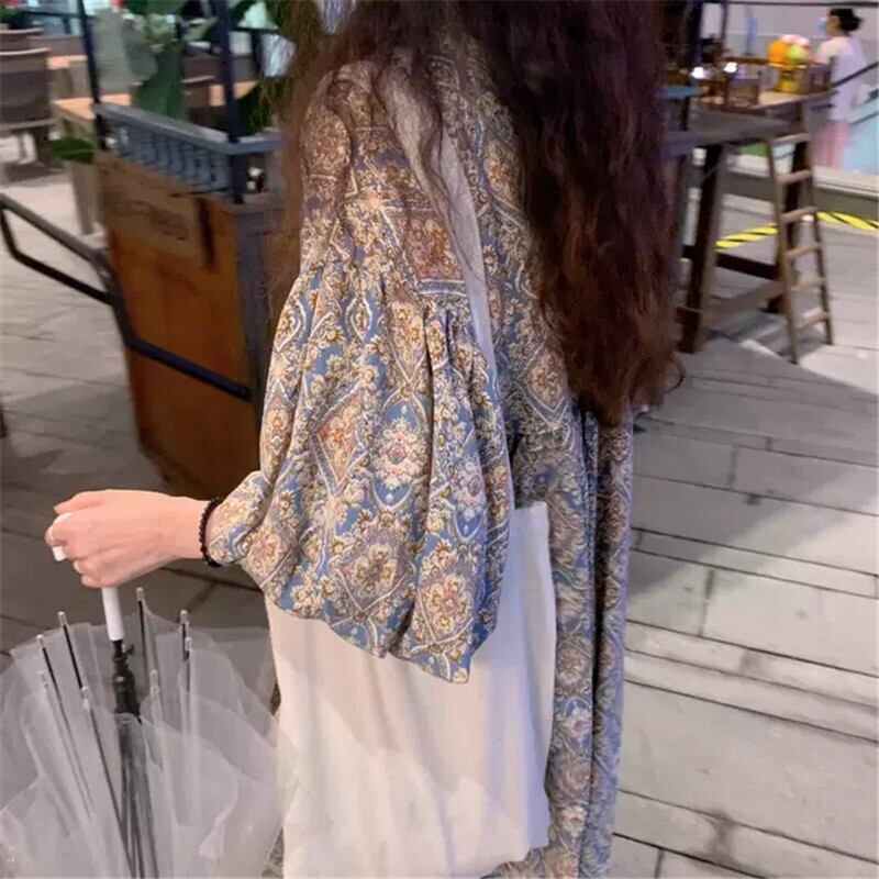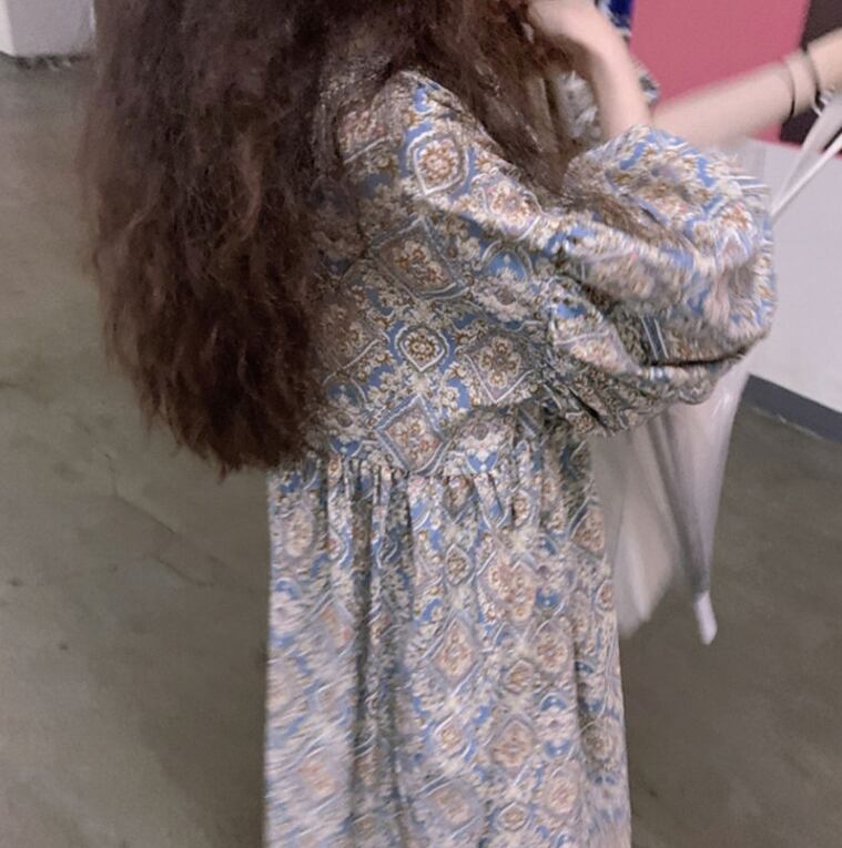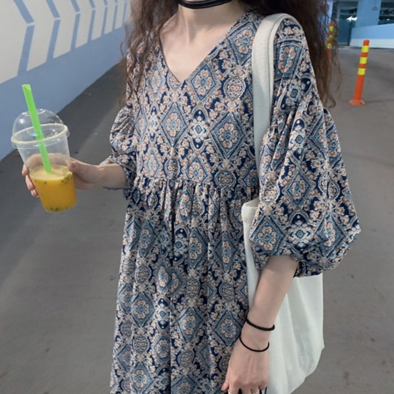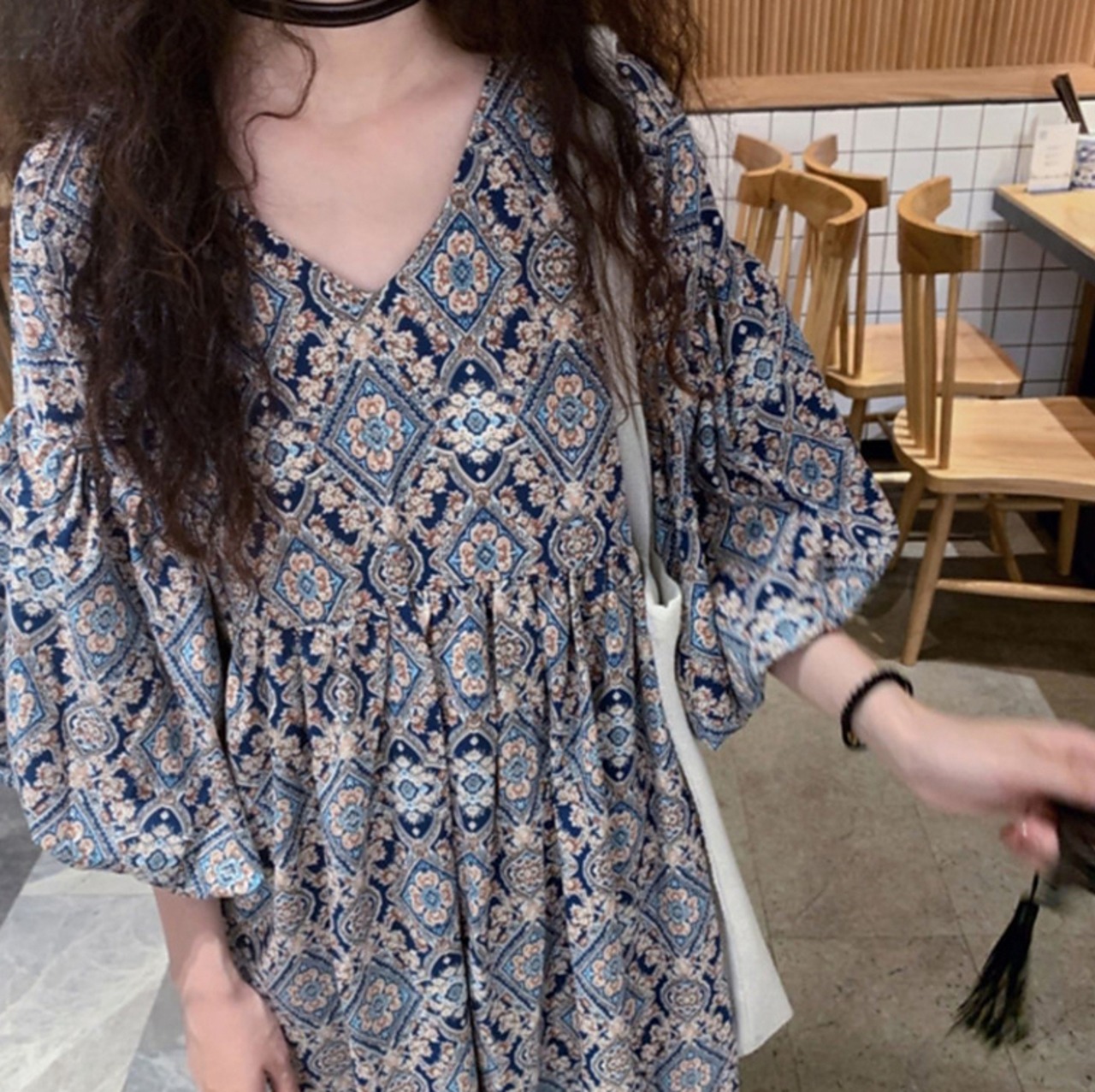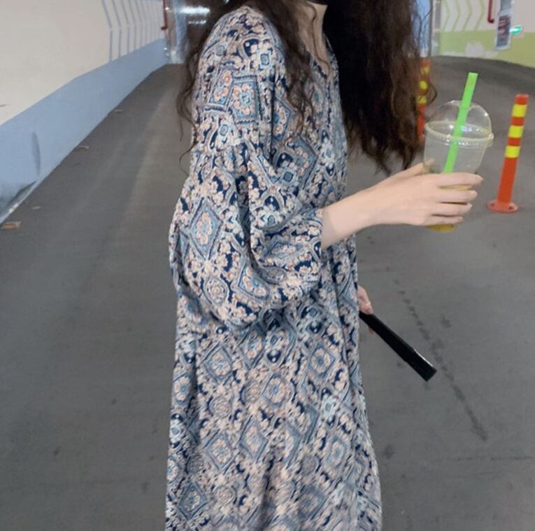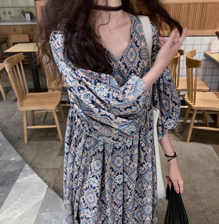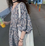 ワンピース ロング丈 マキシ丈 5分袖 パフスリーブ Vネック Aライン シフォン かわいい 大人可愛い きれいめ 大人 上品 おしゃれ エキゾチック 大人可愛い 大人女子 こなれ感 ラフ 柄 オールシーズン 20代 30代 レディース 女性用 マタニティ OL デート お出かけ 女子会 お泊まり 休日 アウトドア パーティー イベント リゾート 旅行 普段使い 楽ちん モテ M L XL 2XL 3XL ゆったり ブルー