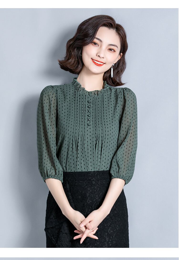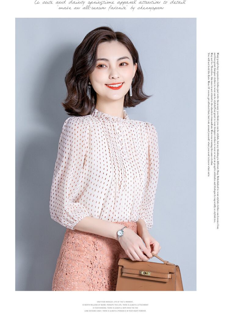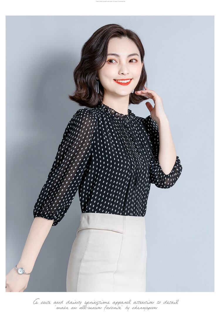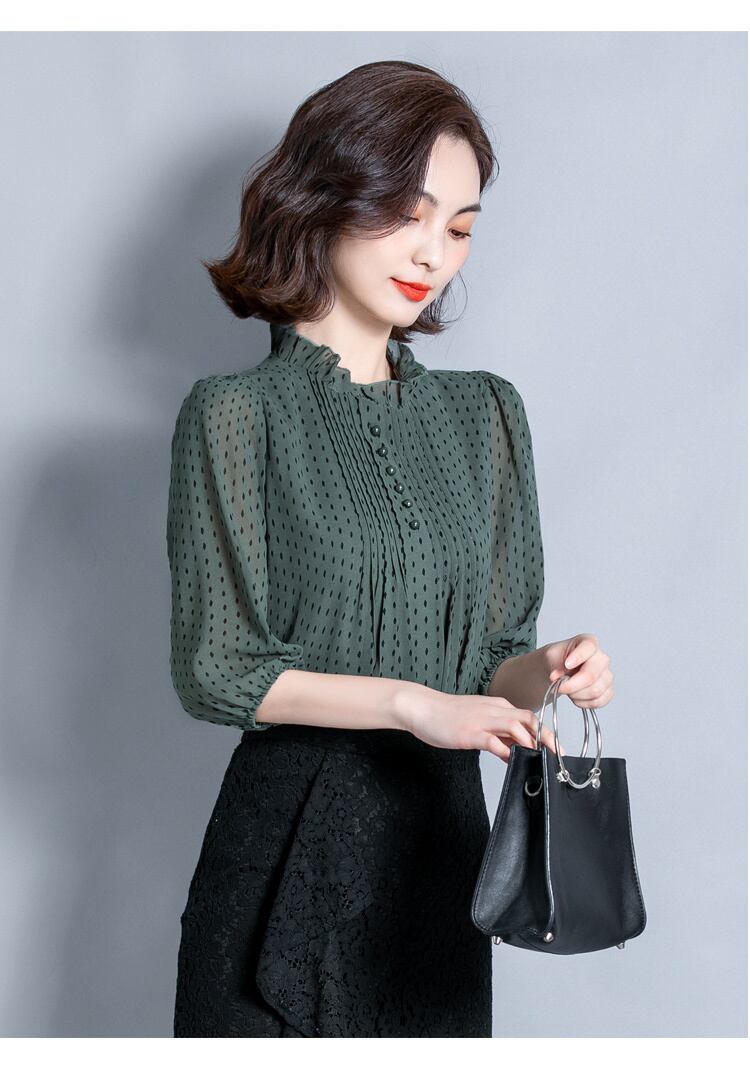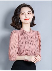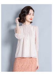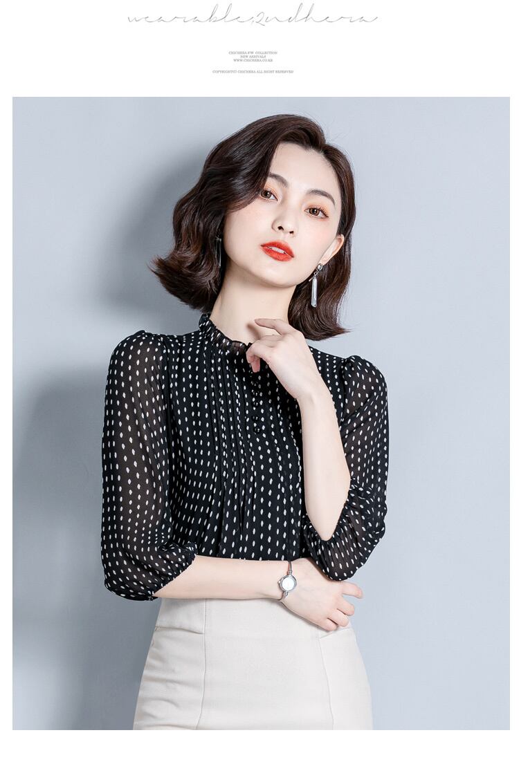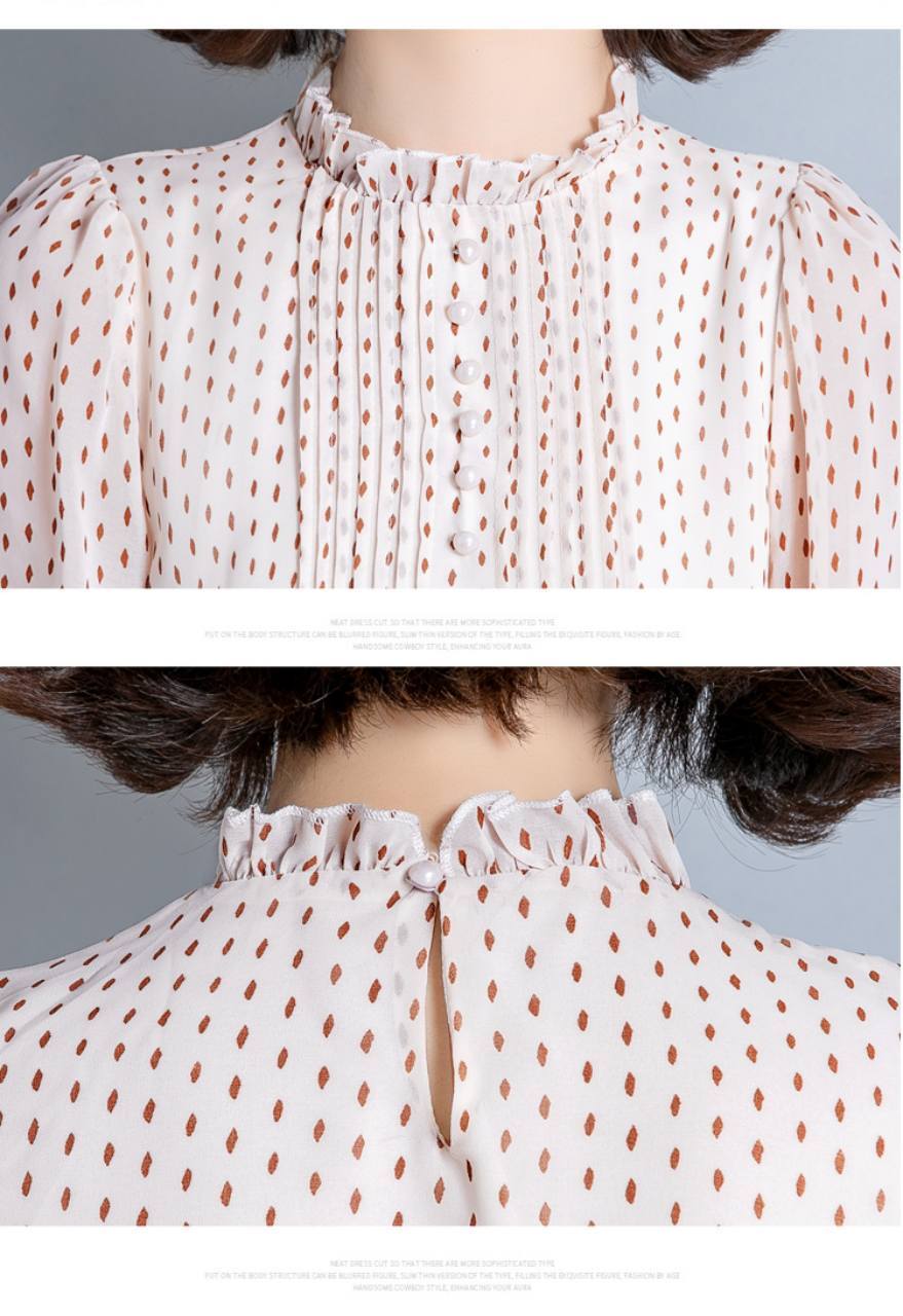 襟元のフリルがエレガントなドット柄ブラウスです。