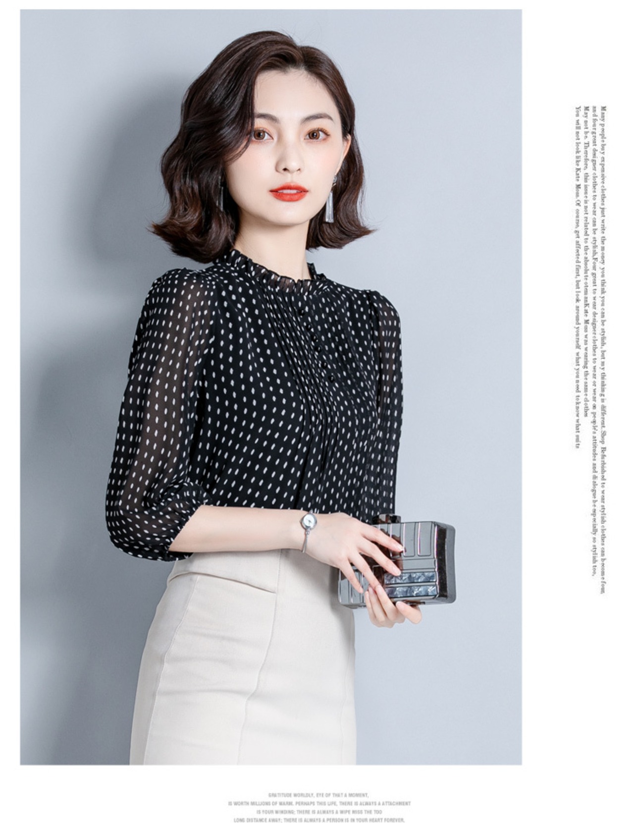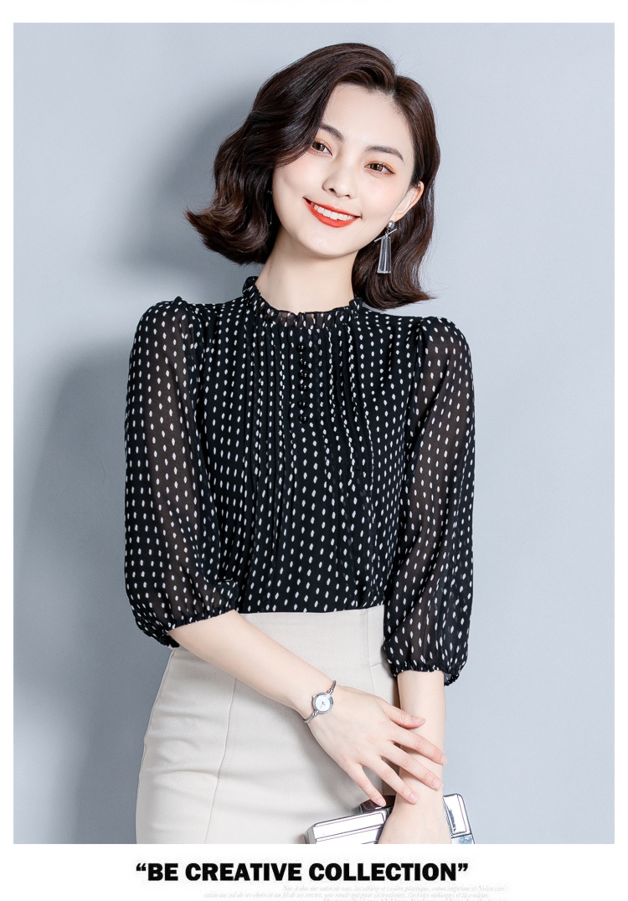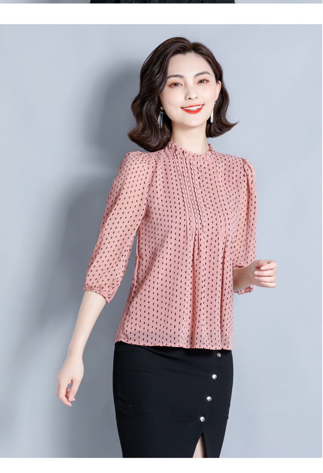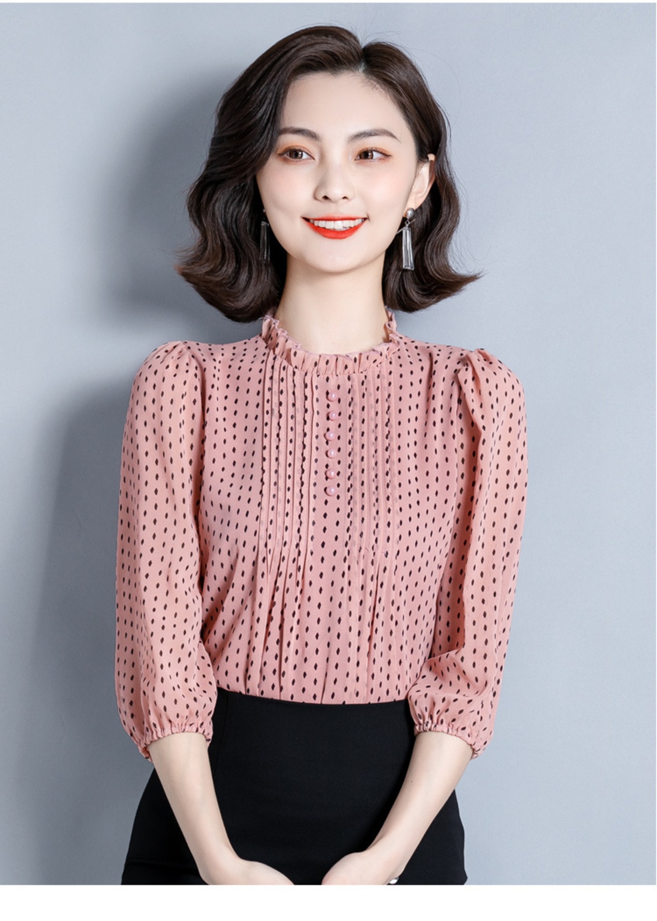 襟元のフリルがエレガントなドット柄ブラウスです。