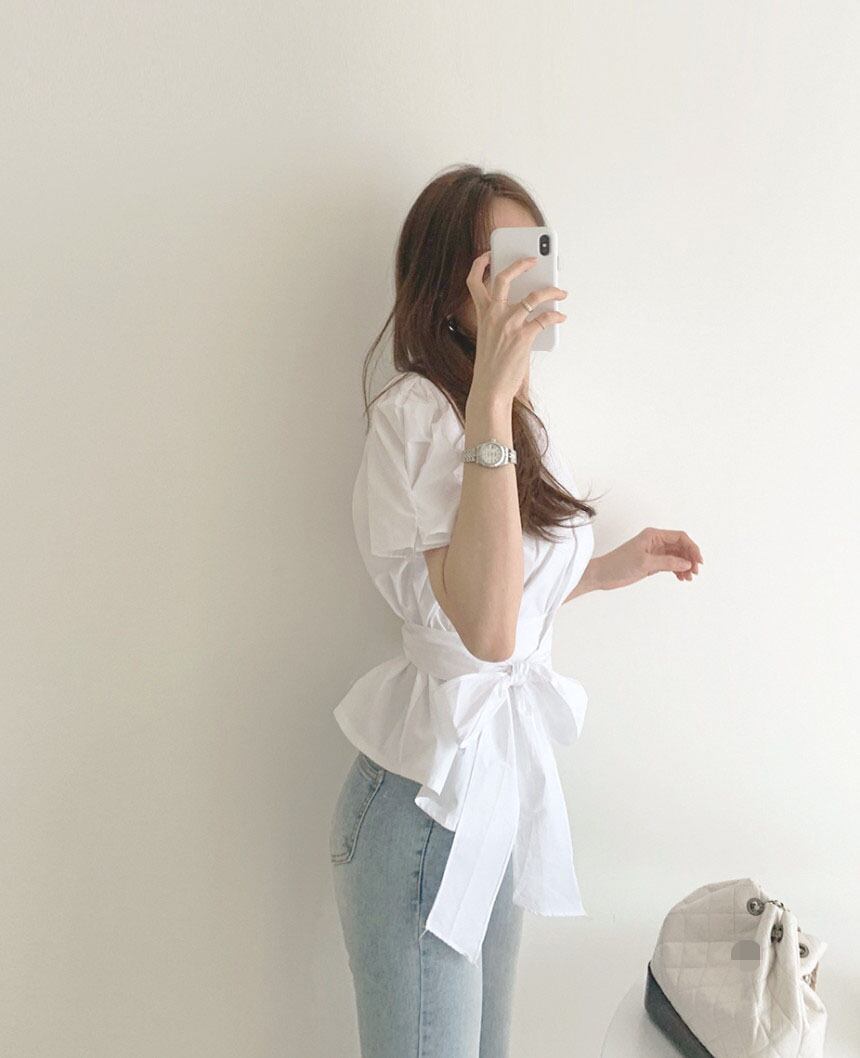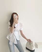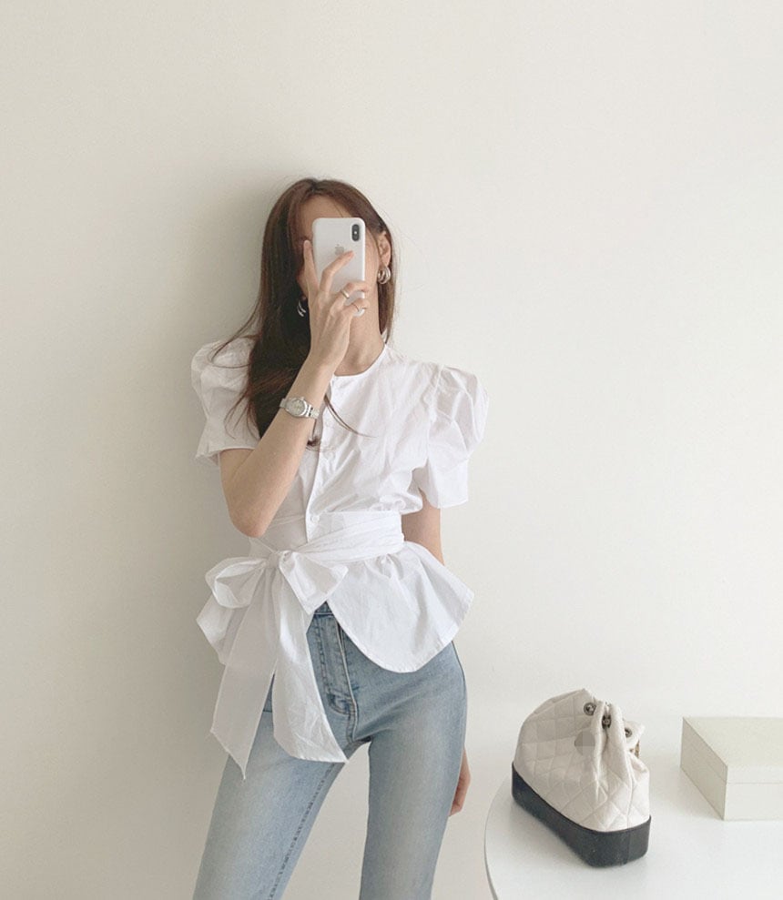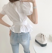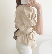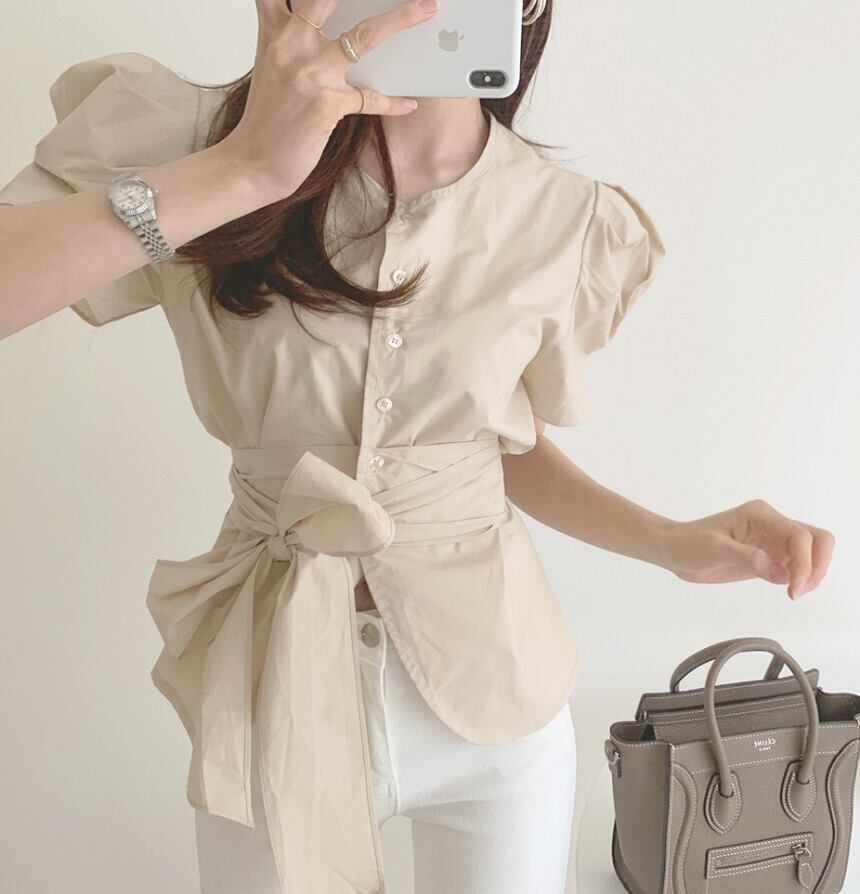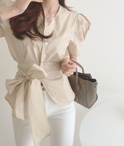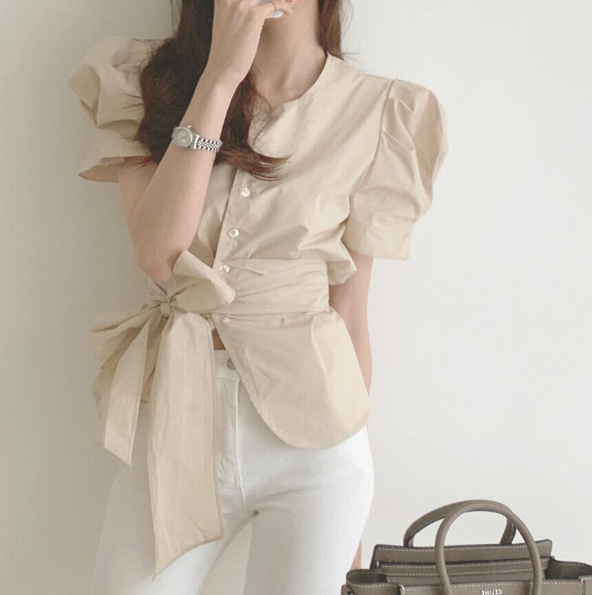 トップス シャツ ブラウス 袖あり 半袖 ボリューム袖 ラウンドネック ペプラム リボン ベルト ウエストマーク ウエストリボン バックリボン 大人可愛い きれいめ シンプル 大人 上品 おしゃれ 大人女子 こなれ感 ラフ ラブリー キュート エレガント 主役級 存在感 とろみ感 抜け感 春 夏 10代 20代 30代 40代 レディース 女性用 通勤 学生 通学 デート お出かけ 女子会 休日 ホテル ガーデン レストラン モテ S M 白 ホワイト 茶色 ブラウン ベージュ