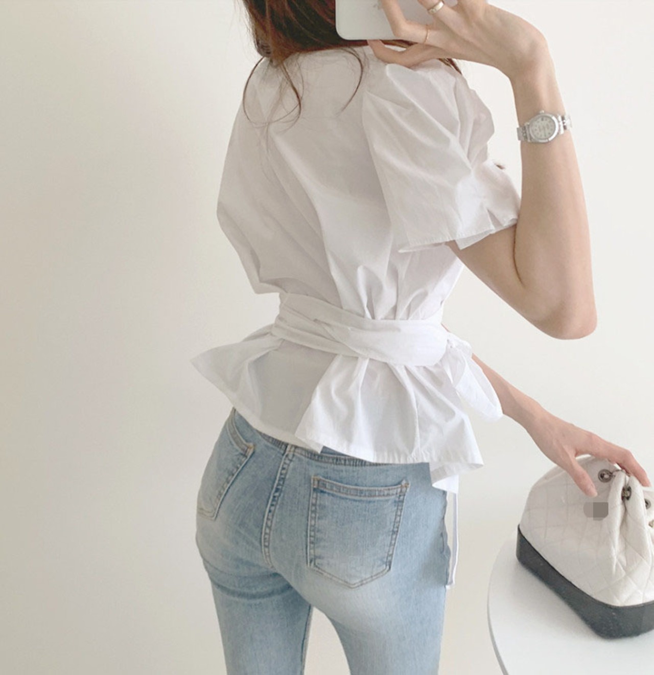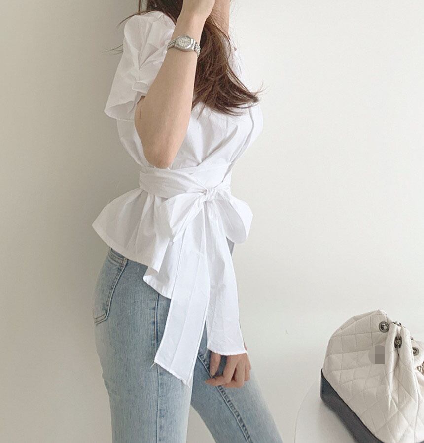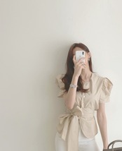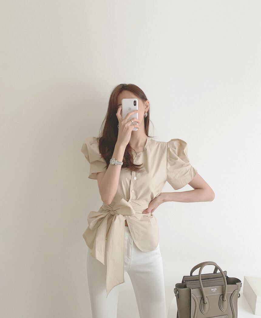 トップス シャツ ブラウス 袖あり 半袖 ボリューム袖 ラウンドネック ペプラム リボン ベルト ウエストマーク ウエストリボン バックリボン 大人可愛い きれいめ シンプル 大人 上品 おしゃれ 大人女子 こなれ感 ラフ ラブリー キュート エレガント 主役級 存在感 とろみ感 抜け感 春 夏 10代 20代 30代 40代 レディース 女性用 通勤 学生 通学 デート お出かけ 女子会 休日 ホテル ガーデン レストラン モテ S M 白 ホワイト 茶色 ブラウン ベージュ