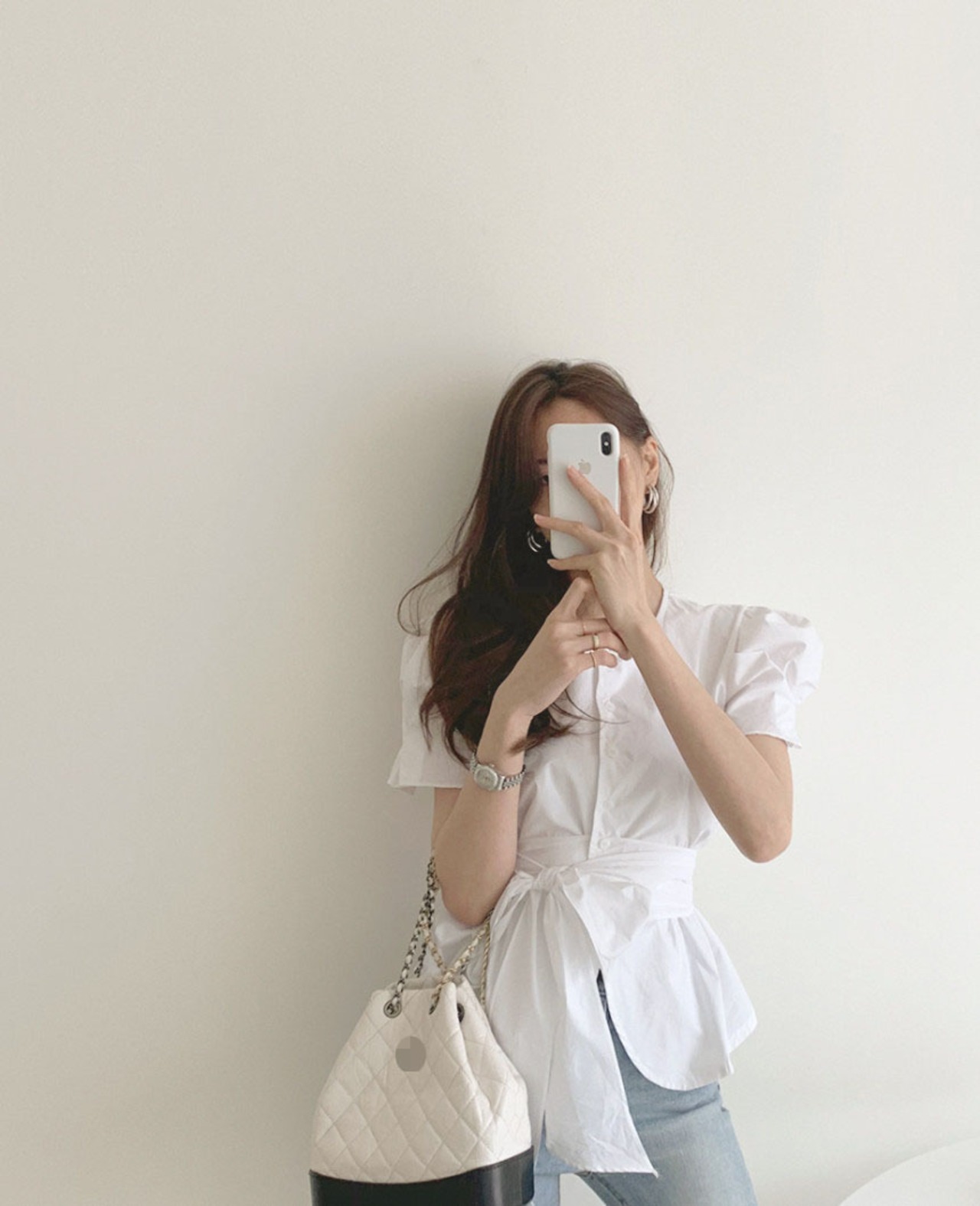 パフスリーブとウエストのリボンが大人可愛い印象に。