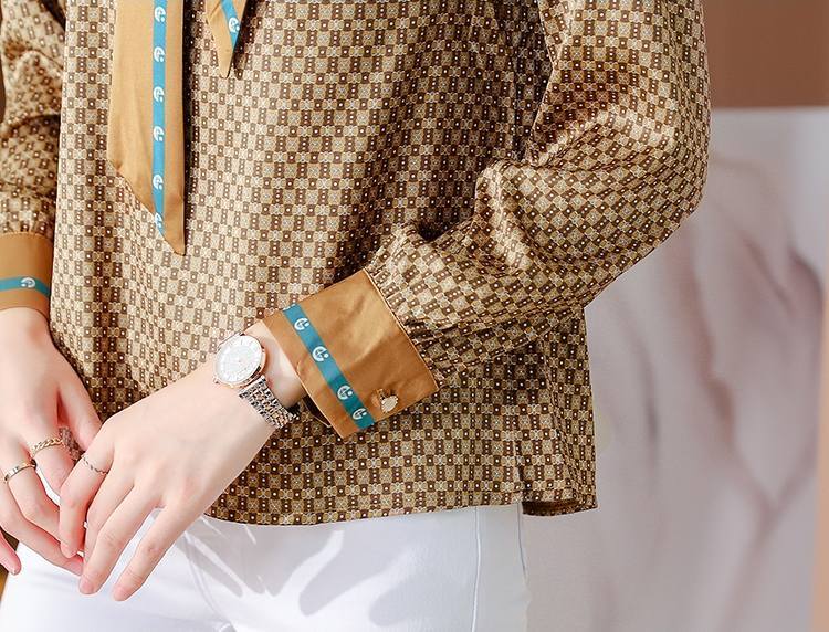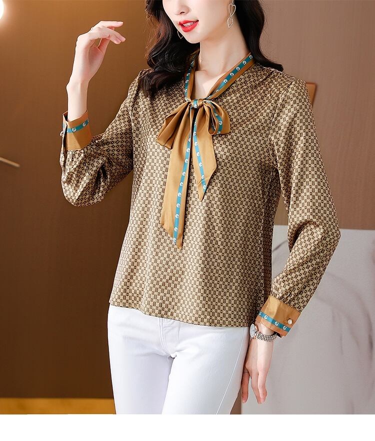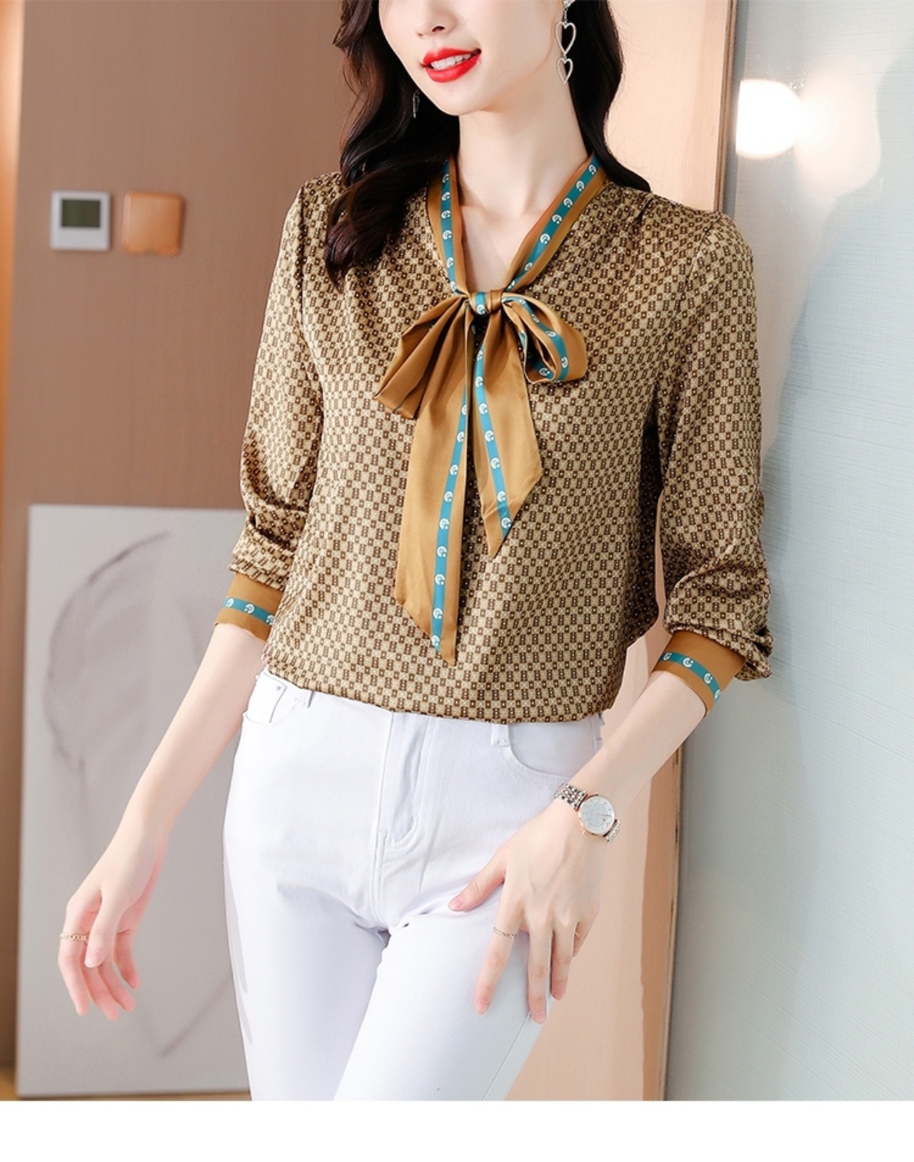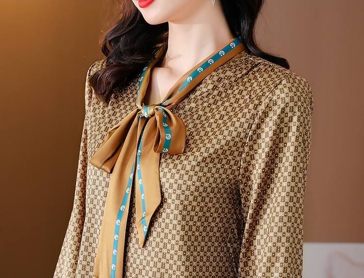 個性的 トップス シャツ ブラウス 袖あり 長袖 Vネック ボウタイ Iライン スマート シフォン サテン かわいい 大人可愛い きれいめ 大人 上品 おしゃれ お洒落 かっこいい レトロ 大人女子 エレガント 主役級 存在感 とろみ感 抜け感 フェミニン 柄 総柄 秋 冬 10代 20代 30代 40代 レディース 女性用 オフィス OL 学生 通学 デート お出かけ 着回し 普段使い モテ M L XL 2XL 3XL 大きいサイズ 大きい 大きめ ビッグサイズ ブラウン