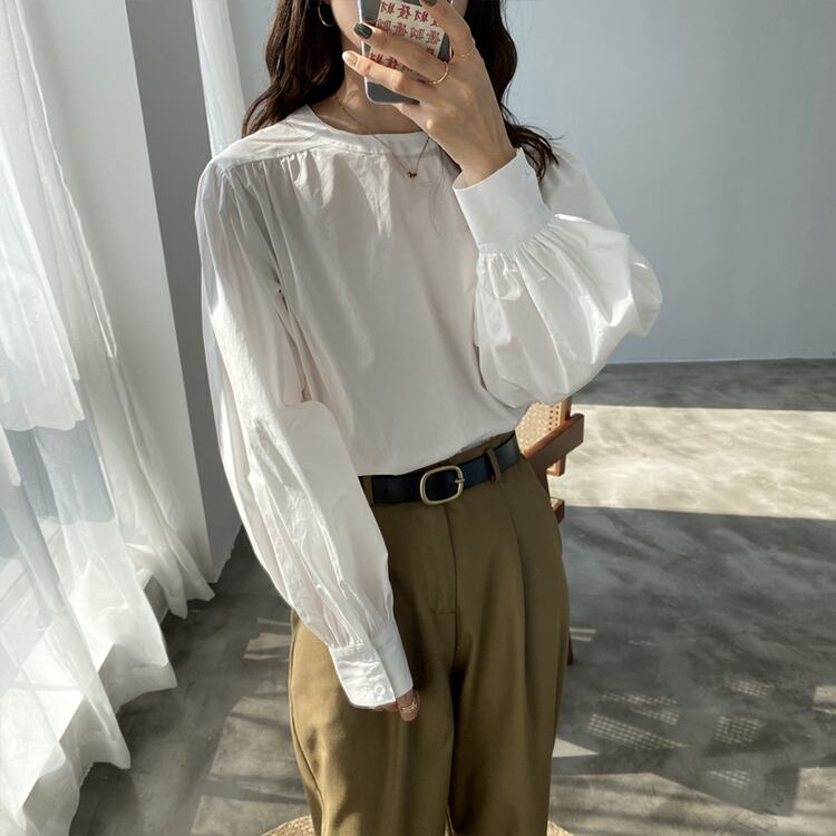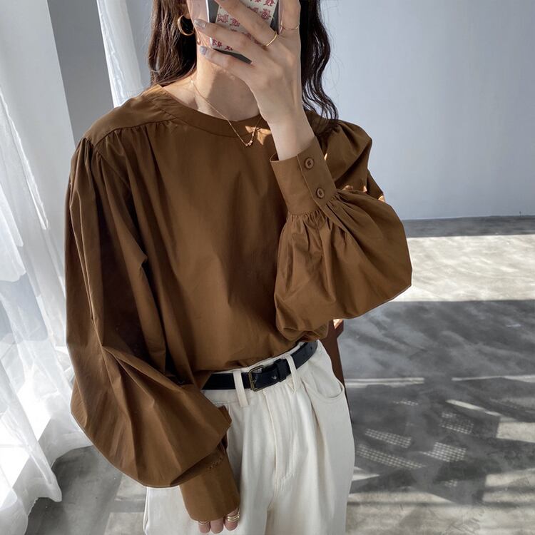 トップス ブラウス 袖あり 長袖 ボリューム袖 ラウンドネック ワイド 薄手 シンプル カジュアル 大人 おしゃれ お洒落 大人女子 こなれ感 ラフ メンズライク マニッシュ ボーイッシュ とろみ感 抜け感 無地 春 夏 10代 20代 30代 40代 50代 60代 レディース 女性用 通学 デート お出かけ 休日 普段使い 重ね着 ファッション コーデ スタイル 楽ちん 体系カバー M L 白 ホワイト 茶色 ブラウン