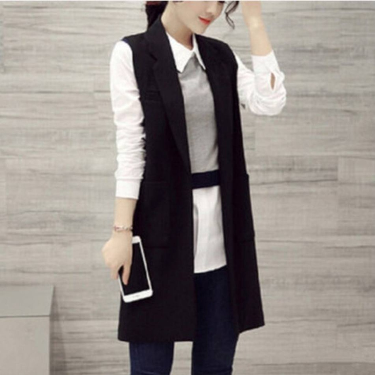 アンサンブル トップス アウター ベスト ジャケット 膝上 袖なし ノースリーブ 襟付き ノッチラペル ショールカラー ストレート Iライン スマート かわいい 大人可愛い きれいめ シンプル カジュアル 大人 上品 おしゃれ お洒落 かっこいい 大人可愛い 大人女子 こなれ感 ラフ メンズライク マニッシュ ボーイッシュ クール モード系 エレガント モダン 無地 春 秋 学生 通学 デート 着回し 普段使い 重ね着 モテ 体系カバー M L XL 2XL 黒 ブラック
