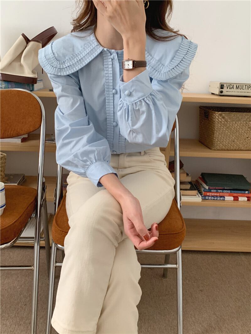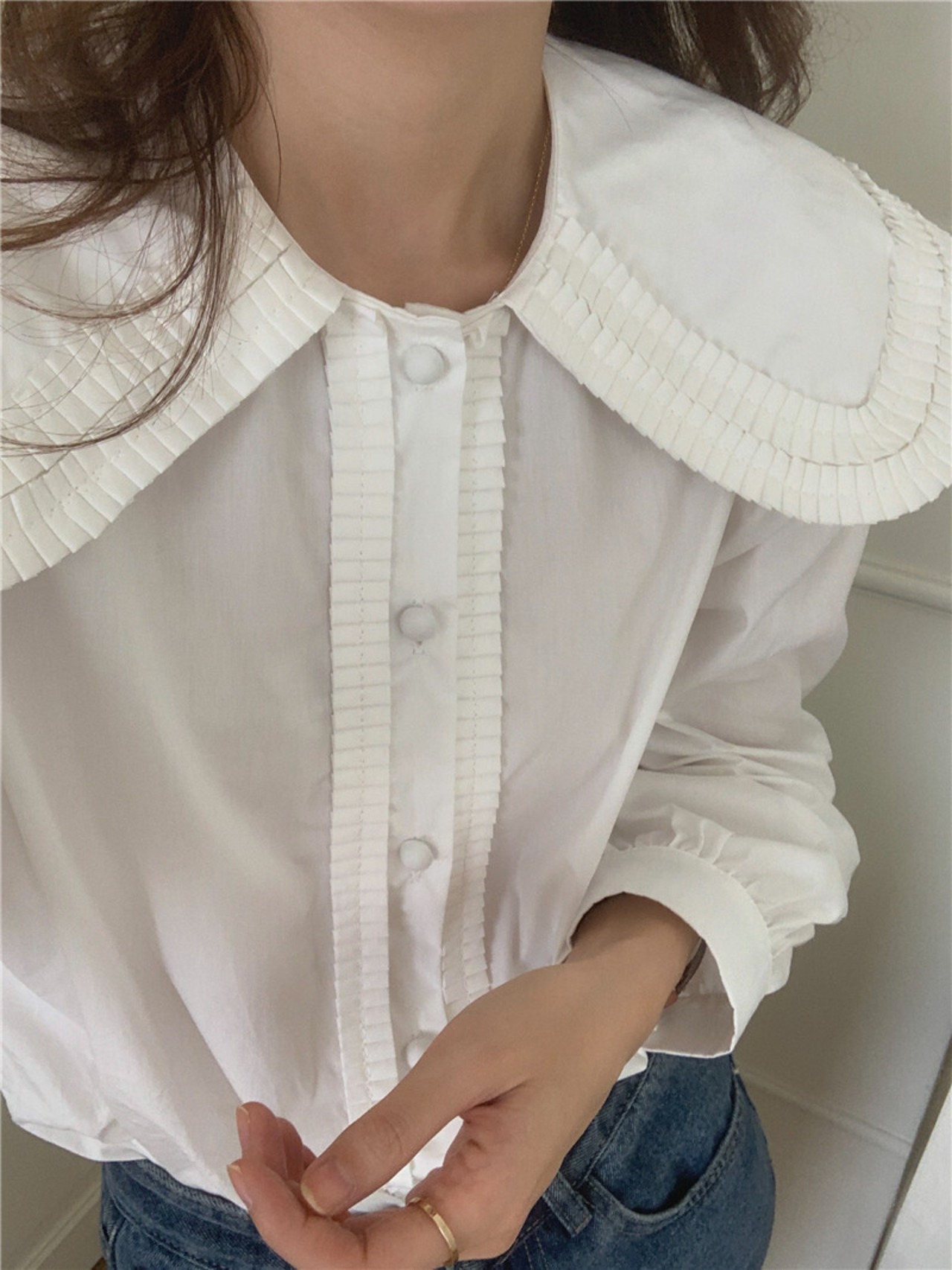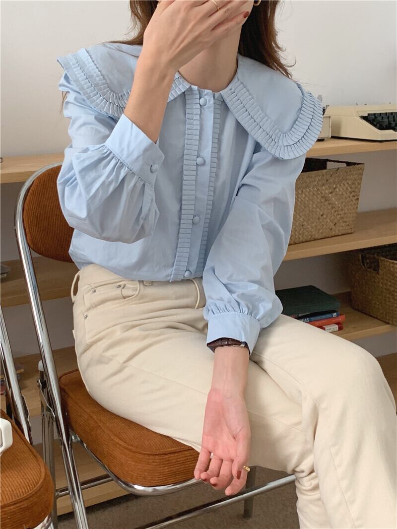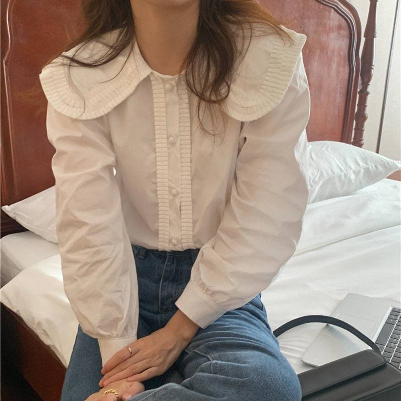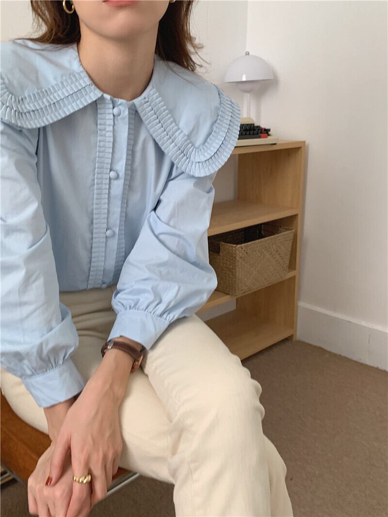 トップス シャツ ブラウス 白シャツ 白トップス 袖あり 長袖 クルーネック 襟付き フリル ギャザー ポリエステル かわいい 大人可愛い きれいめ シンプル カジュアル 大人 上品 おしゃれ お洒落 レトロ 大人女子 こなれ感 キュート ガーリー 個性的 エレガント 抜け感 フェミニン 無地 春 夏 10代 20代 30代 40代 50代 60代 レディース 女性用 学生 通学 デート お出かけ 着回し 普段使い 重ね着 モテ S M L XL ホワイト ブルー