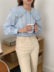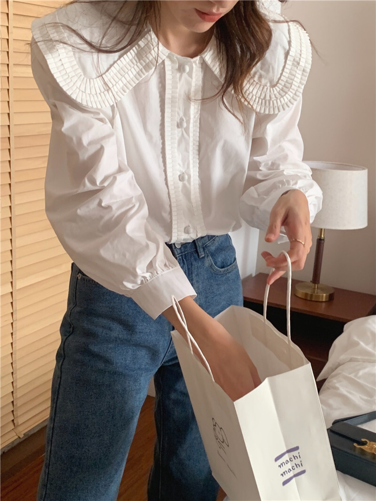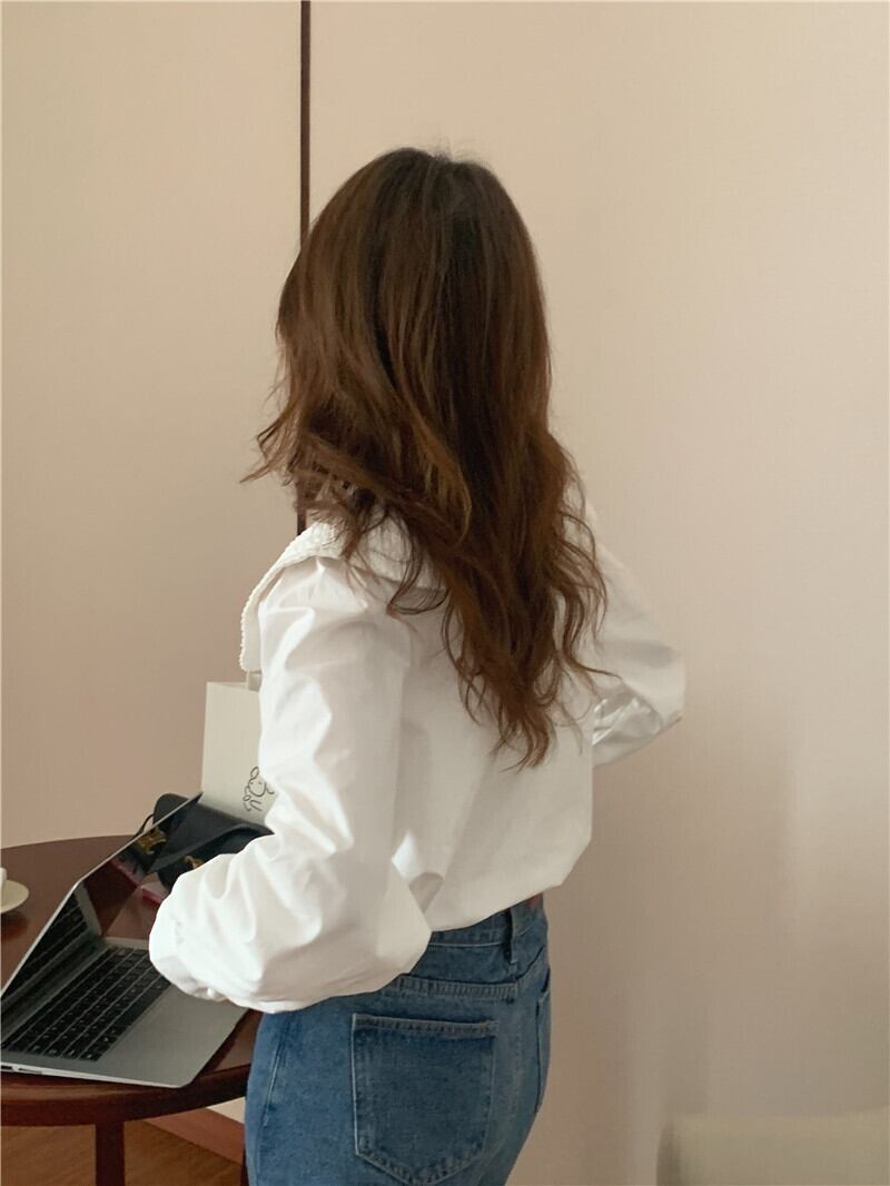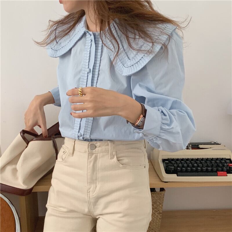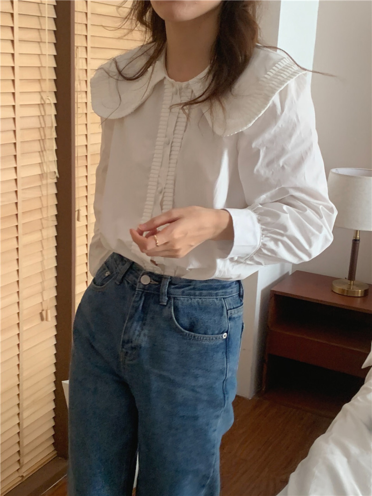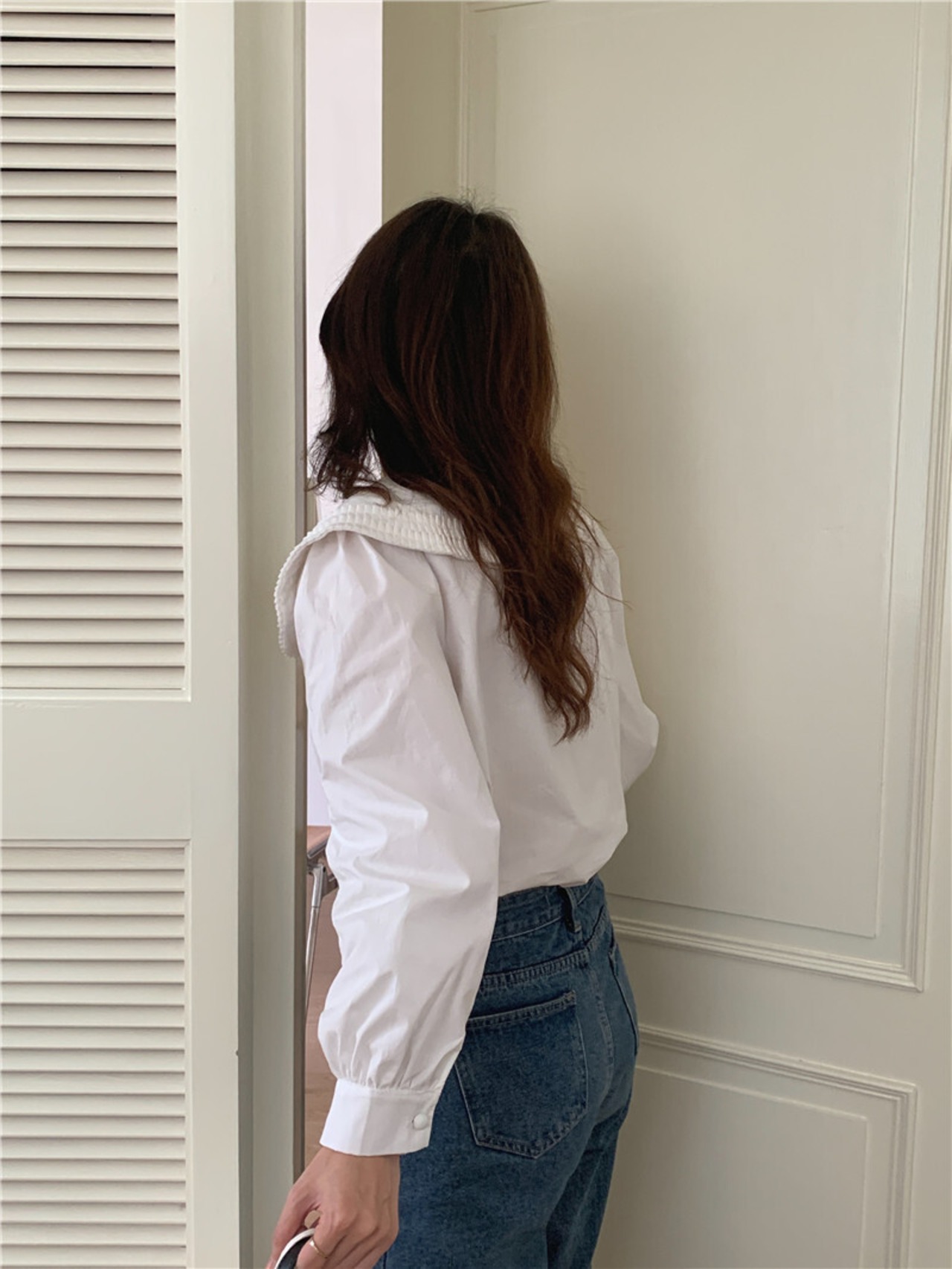 トップス シャツ ブラウス 白シャツ 白トップス 袖あり 長袖 クルーネック 襟付き フリル ギャザー ポリエステル かわいい 大人可愛い きれいめ シンプル カジュアル 大人 上品 おしゃれ お洒落 レトロ 大人女子 こなれ感 キュート ガーリー 個性的 エレガント 抜け感 フェミニン 無地 春 夏 10代 20代 30代 40代 50代 60代 レディース 女性用 学生 通学 デート お出かけ 着回し 普段使い 重ね着 モテ S M L XL ホワイト ブルー