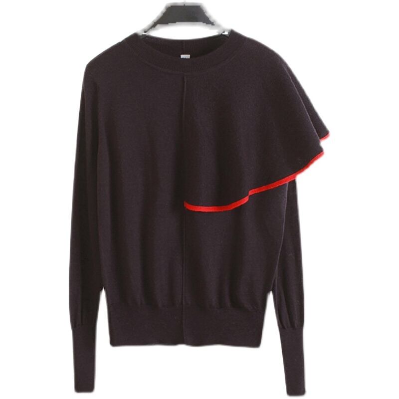トップス Tシャツ ニットソー 袖あり 長袖 クルーネック アシンメトリー フリル ポリエステル ニット かわいい 大人可愛い きれいめ シンプル カジュアル 大人 上品 おしゃれ お洒落 エキゾチック 大人女子 こなれ感 個性的 モード系 エレガント モダン 主役級 存在感 フェミニン 無地 ライン 春 秋 10代 20代 30代 40代 50代 レディース 女性用 着回し 普段使い モテ 体系カバー S M L 黒 ブラック