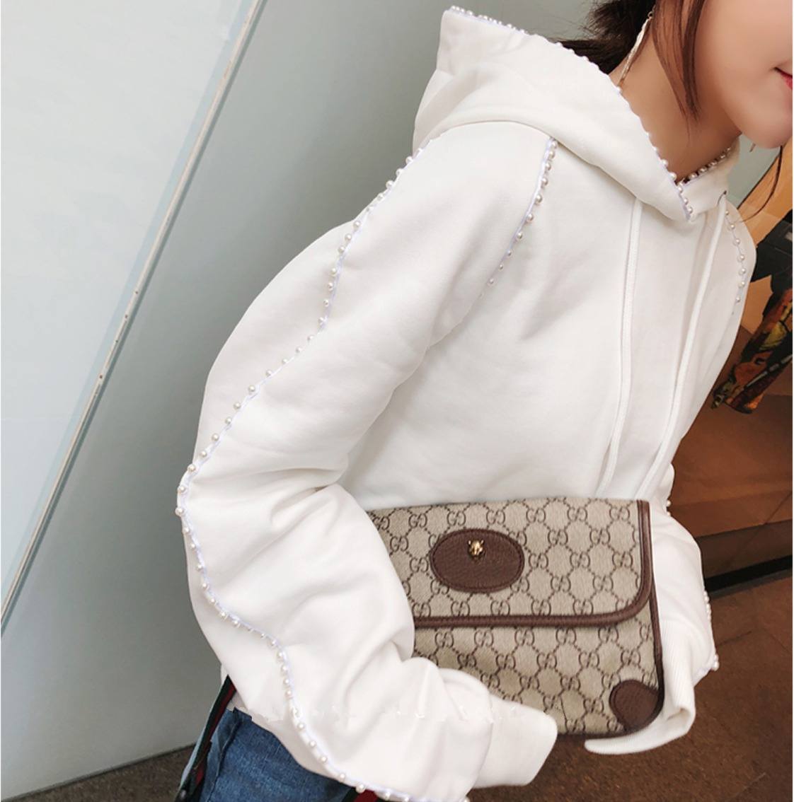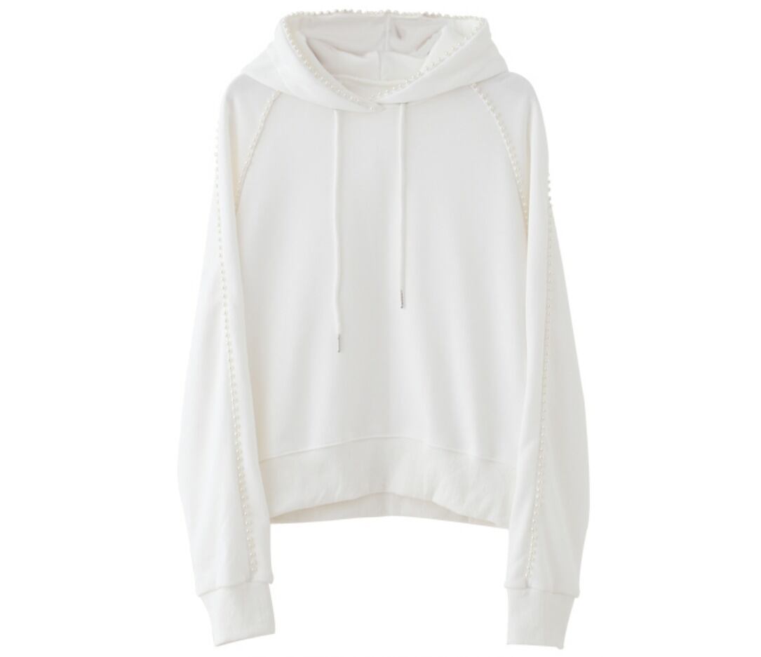 パール調のビーズがあしらわれた可愛らしいフーディです。