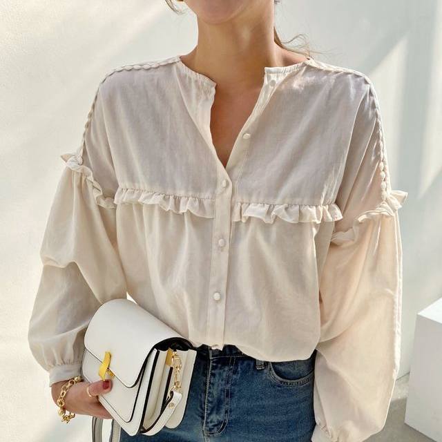 トップス シャツ 白シャツ 白トップス 袖あり 長袖 パフスリーブ ドロップショルダー Vネック クルーネック 襟なし フリル 前開き 綿 コットン かわいい 大人可愛い きれいめ シンプル カジュアル 大人 上品 おしゃれ お洒落 レトロ 大人女子 こなれ感 ラフ キュート ガーリー ルーズ 個性的 エレガント 抜け感 フェミニン 無地 春 秋 10代 20代 30代 40代 50代 60代 レディース 女性用 学生 通学 デート お出かけ 休日 着回し 普段使い モテ 体系カバー オフホワイト ピンク