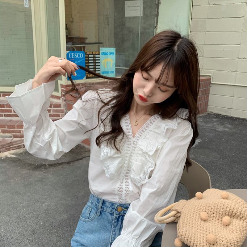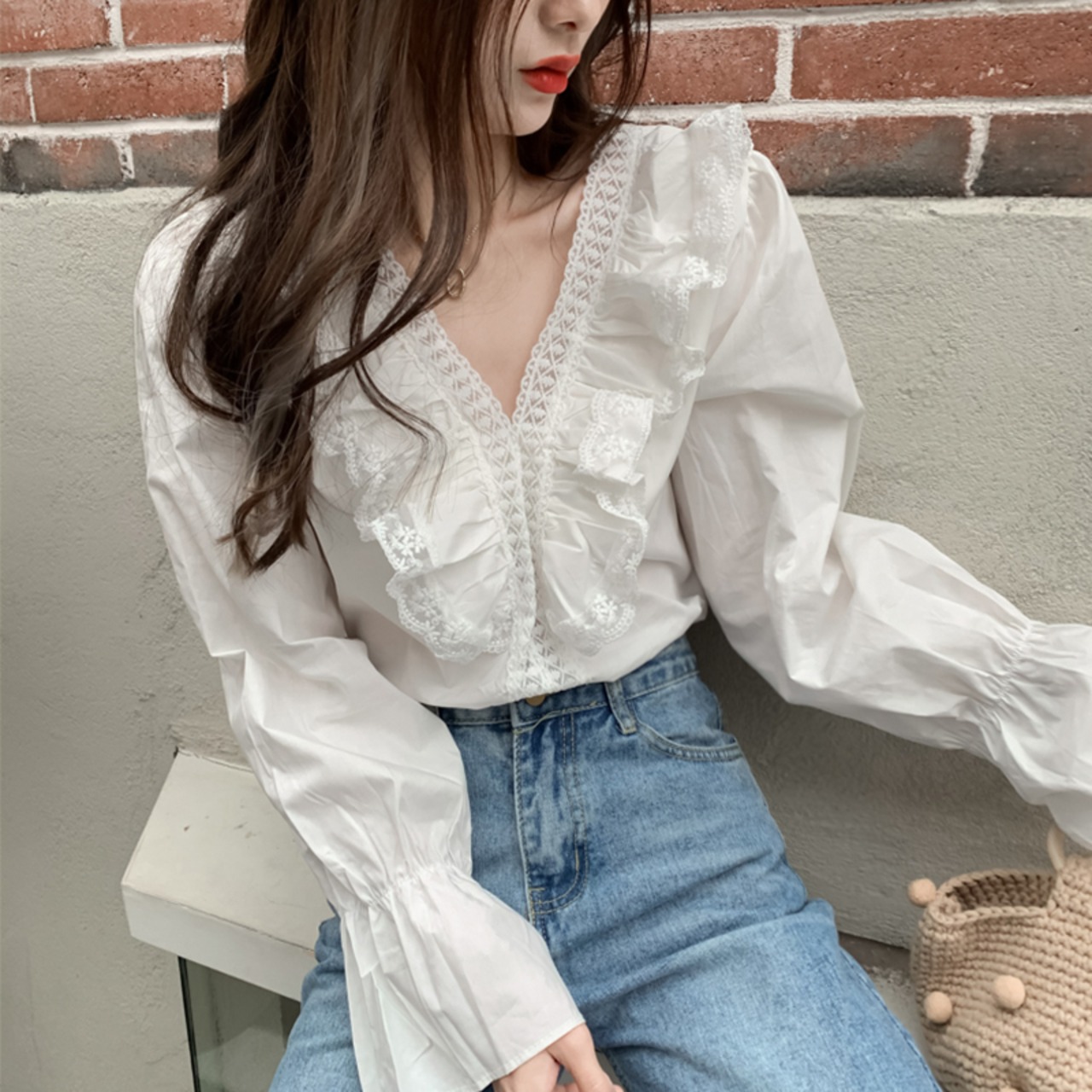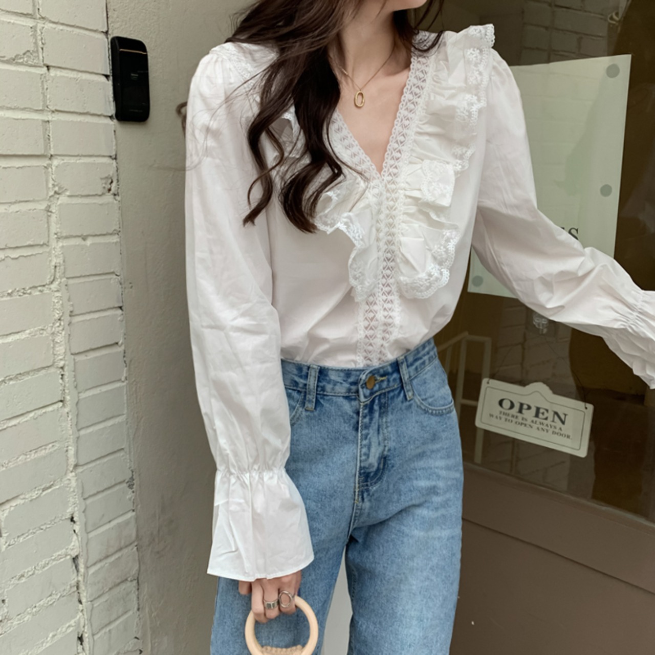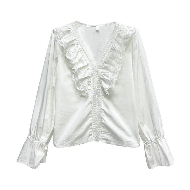 トップス シャツ ブラウス プルオーバー 白シャツ 白トップス 袖あり 長袖 フレアスリーブ Vネック レース フリル かわいい 大人可愛い きれいめ カジュアル 大人 上品 おしゃれ お洒落 かっこいい レトロ 大人女子 キュート ガーリー 個性的 クール エレガント 主役級 存在感 フェミニン 無地 春 夏 秋 結婚式 二次会 披露宴 10代 20代 30代 40代 レディース 女性用 学生 通学 デート お出かけ 休日 パーティー 着回し 普段使い モテ フリーサイズ ゆったり ゆる ホワイト