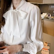 トップス シャツ ブラウス 白シャツ 白トップス 袖あり 長袖 スタンドカラー 立ち襟 ボウタイ リボン 前開き ボタン サテン かわいい 大人可愛い きれいめ シンプル カジュアル 大人 上品 おしゃれ お洒落 かっこいい レトロ 大人女子 こなれ感 キュート ガーリー エレガント フォーマル とろみ感 フェミニン 無地 春 秋 10代 20代 30代 レディース 女性用 学生 通学 デート お出かけ 休日 着回し 普段使い モテ 体系カバー S M L XL 2XL 4色展開