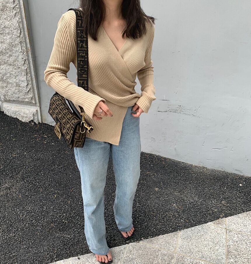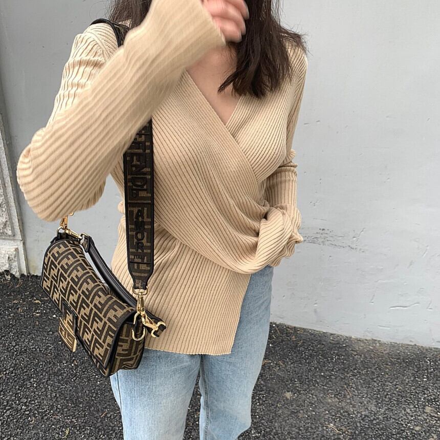 ざっくりと開いたVネックで首周りをスッキリと見せ、小顔効果にも期待できます。