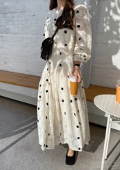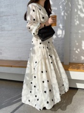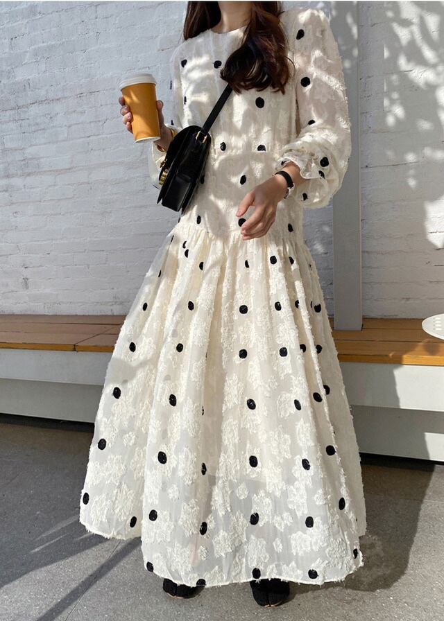 ワンピース フレアワンピース ティアードワンピース ロング ロング丈 マキシ マキシ丈 袖あり 長袖 ボリューム袖 ラウンドネック フレア セミフレア 刺繍 大人可愛い おしゃれ お洒落 ラブリー キュート ガーリー 個性的 主役級 存在感 ドット柄 水玉 春 夏 秋 10代 20代 30代 レディース 女性用 デート お出かけ 女子会 ホテル ガーデン レストラン ファッション コーデ スタイル モテ フリーサイズ 白 ホワイト