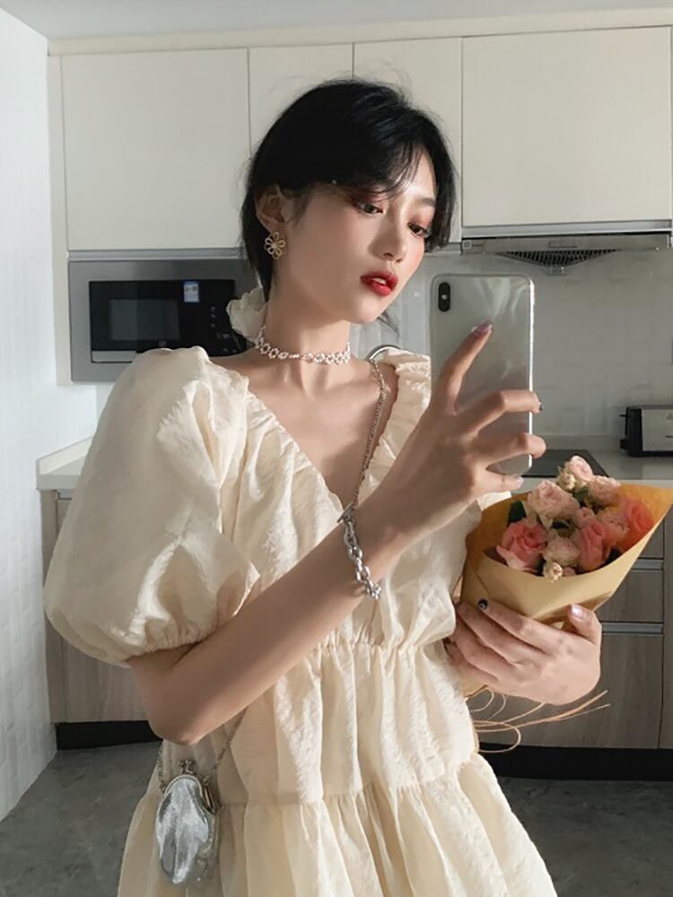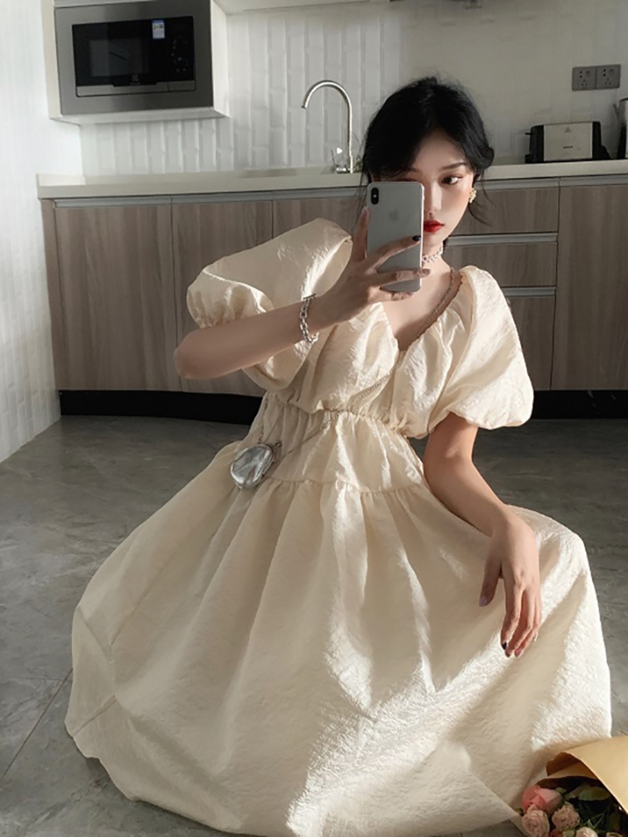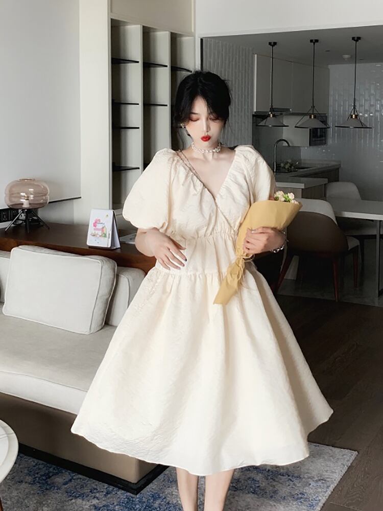 ワンピース フレアワンピース ひざ丈 膝下 ミモレ ミモレ丈 袖あり パフスリーブ Vネック フレア Aライン 大人可愛い きれいめ シンプル カジュアル 大人 上品 おしゃれ こなれ感 ラブリー キュート ガーリー エレガント 主役級 存在感 春 夏 10代 20代 30代 レディース 女性用 デート お出かけ ホテル ガーデン レストラン ファッション コーデ スタイル 楽ちん モテ 体系カバー 定番 トレンド 流行 インスタ映え S M L 白 ホワイト