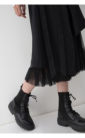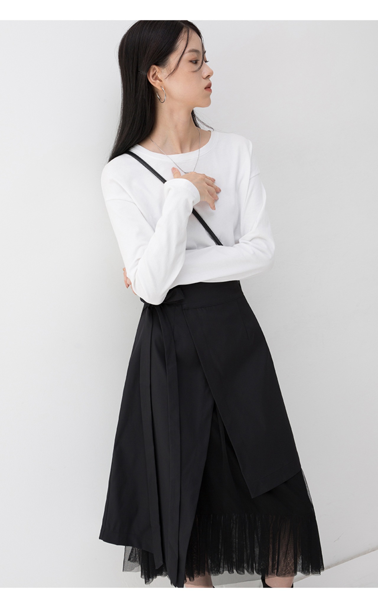 全体的にシックでカッコイイ印象でありながら、ウエストリボンやチュールが可愛らしさも兼ねそろえた魅力的な一着です。