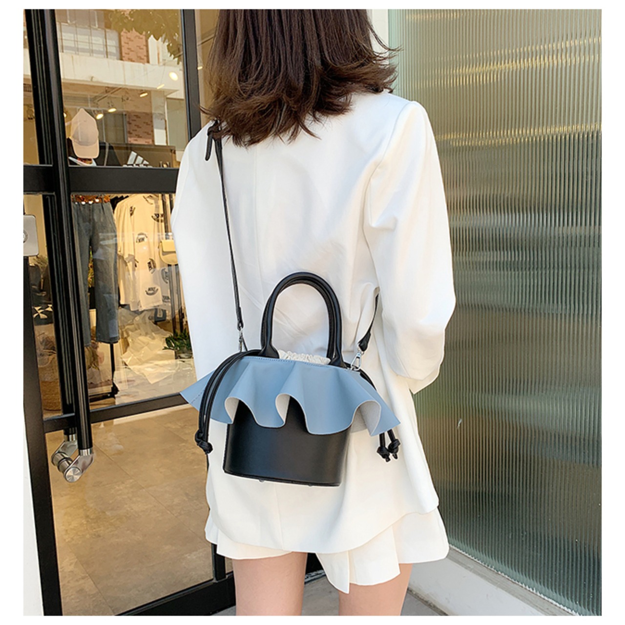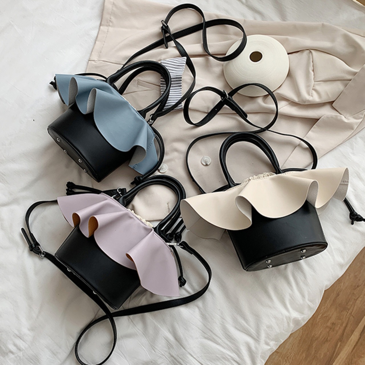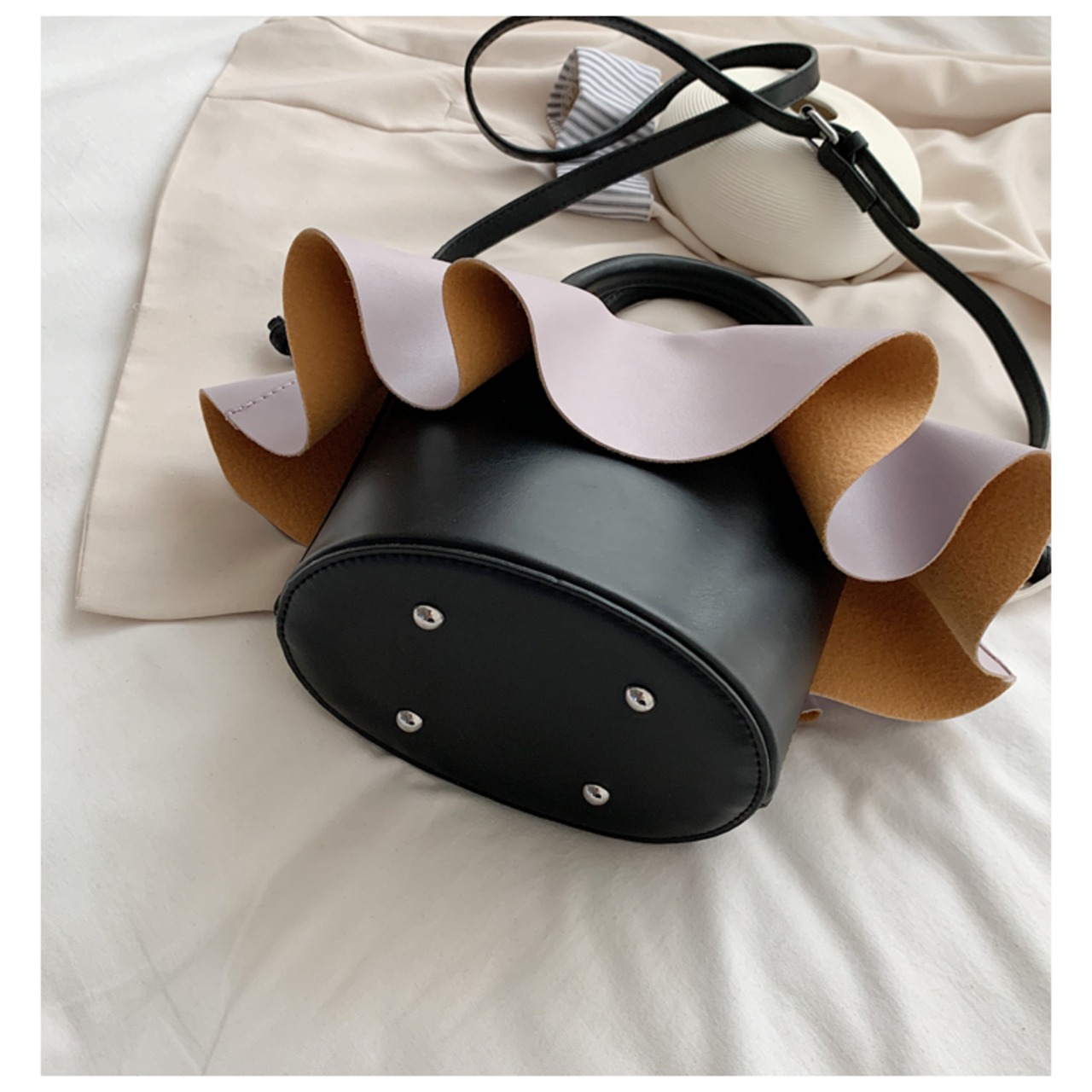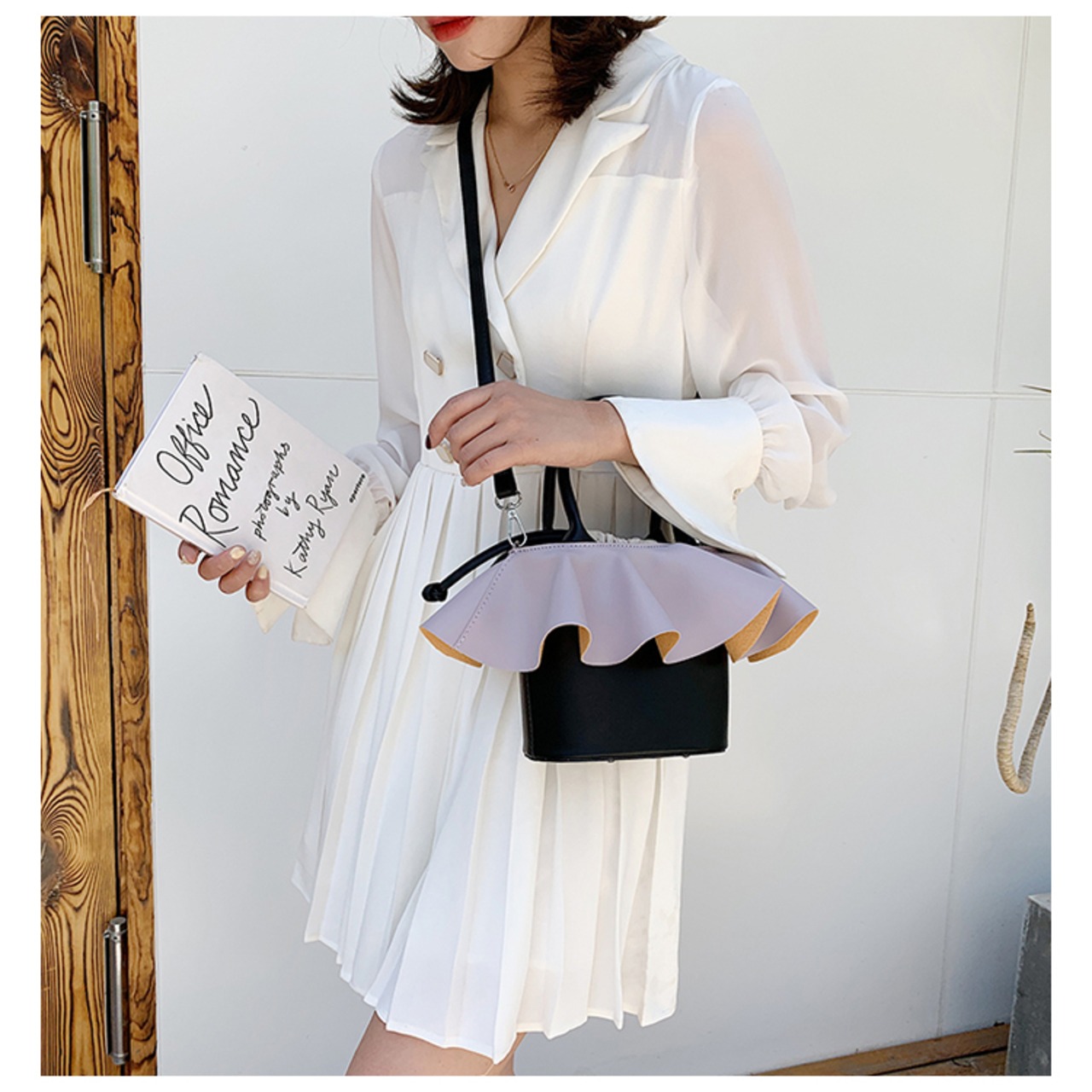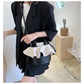 大きなフリルが可愛らしい印象のラウンド方バッグです。