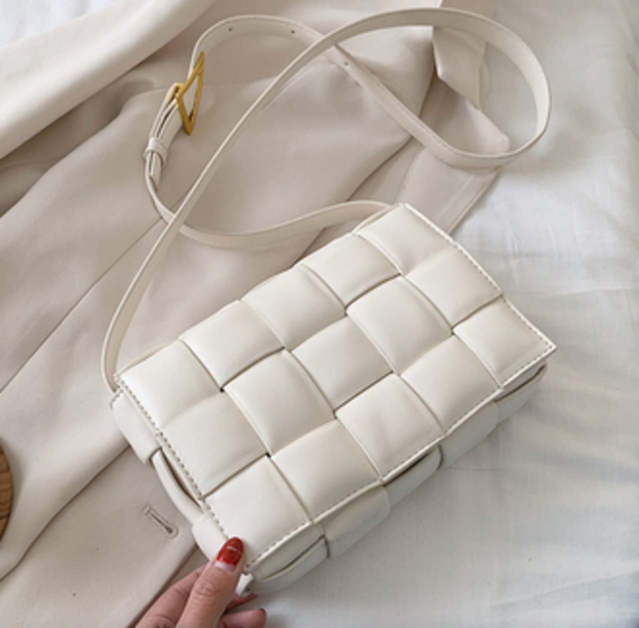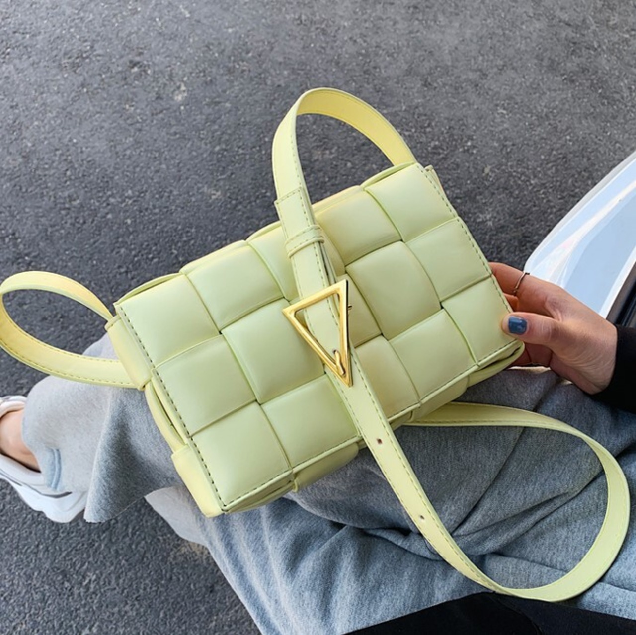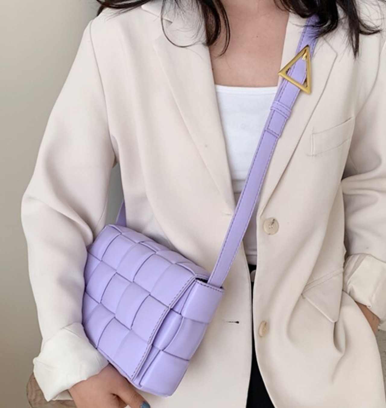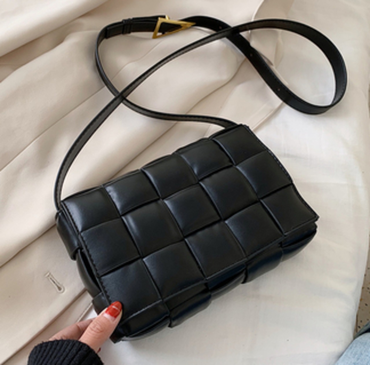 三角のバックルがアクセントのメッセンジャーバッグです。