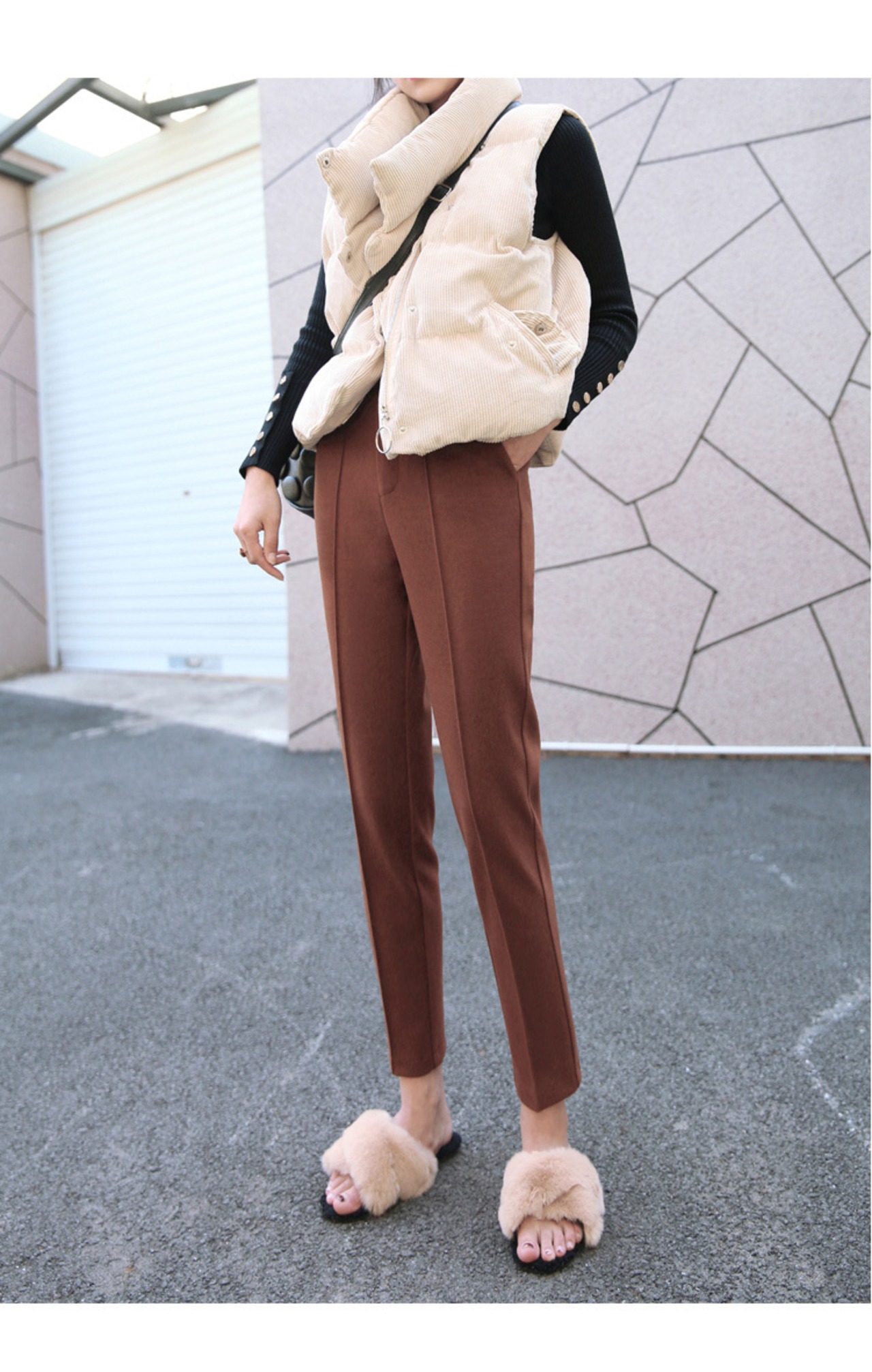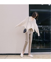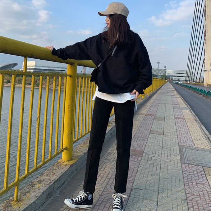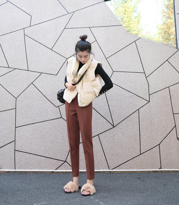 合わせるトップスを選ばない万能アイテムのテーパードパンツです。