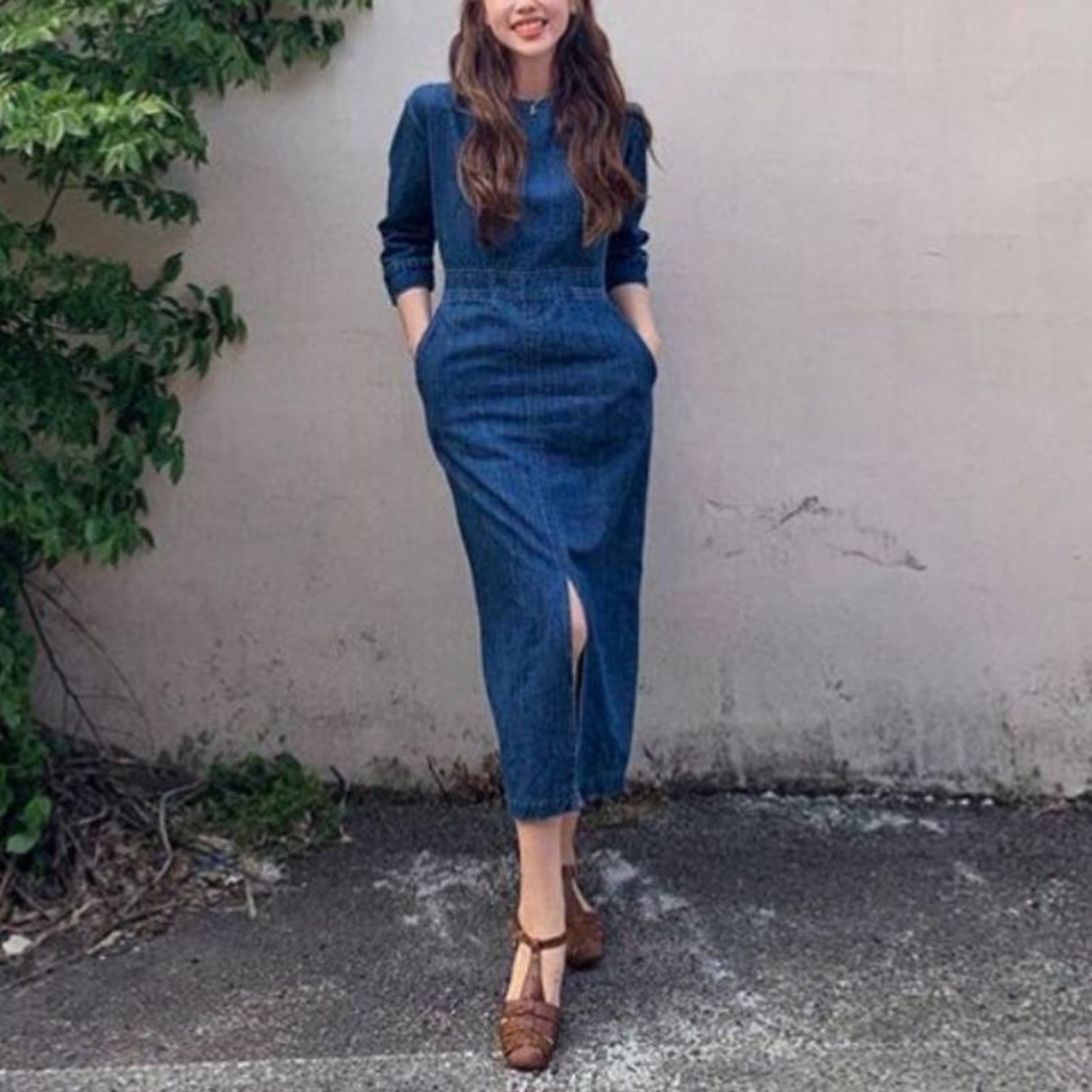ワンピース デニムワンピース タイトワンピース 膝下 ミモレ ミモレ丈 ロング ロング丈 袖あり 7分袖 七分袖 クルーネック スリム タイト 細身 ストレート Iライン スマート スリット ポケット ハイウエスト デニム ブルーデニム かわいい 大人可愛い きれいめ シンプル カジュアル 大人 おしゃれ お洒落 レトロ 大人女子 こなれ感 マニッシュ ボーイッシュ キュート ガーリー モダン フェミニン 無地 春 夏 秋 レディース 女性用 デート お出かけ 休日 普段使い モテ 体系カバー 美脚 脚長