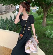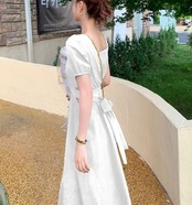 パフスリーブにスクエアネック、ウエスト部分の切り込みやバックのリボンなど、大人可愛さ抜群なワンピースです。