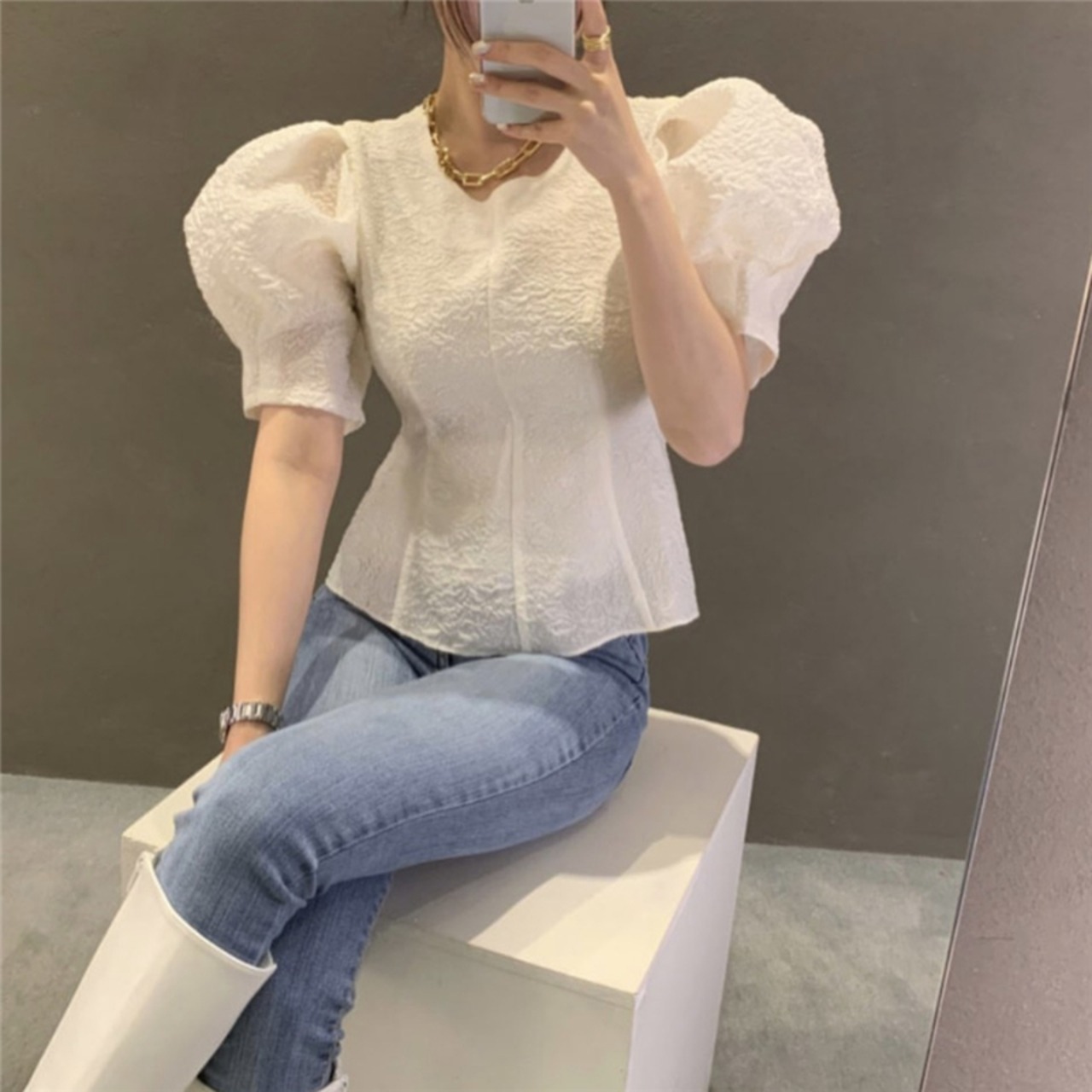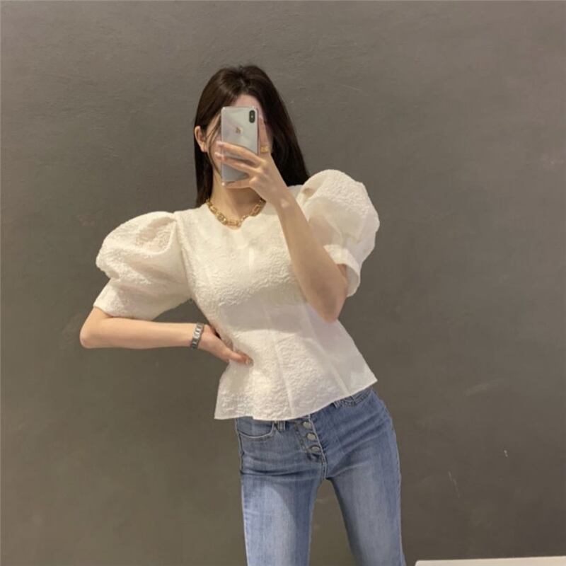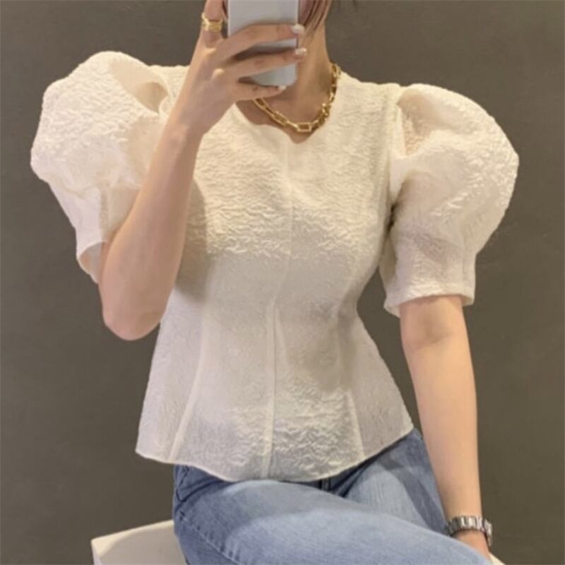 トップス シャツ ブラウス 白トップス 袖あり 半袖 パフスリーブ パワーショルダー ラウンドネック ボートネック スリム 細身 ふわふわ 透け感 かわいい 大人可愛い きれいめ シンプル カジュアル 大人 上品 おしゃれ お洒落 レトロ エキゾチック 大人女子 こなれ感 ラブリー キュート ガーリー 個性的 エレガント 主役級 存在感 抜け感 フェミニン クラシカル 無地 春 夏 レディース 女性用 デート お出かけ 女子会 休日 着回し 普段使い モテ 体系カバー フリーサイズ ホワイト ブラック