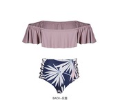 フリルがあしらわれたオフショルダーと、サイドのレースアップがセクシーなショートパンツの別売りセパレート水着です。