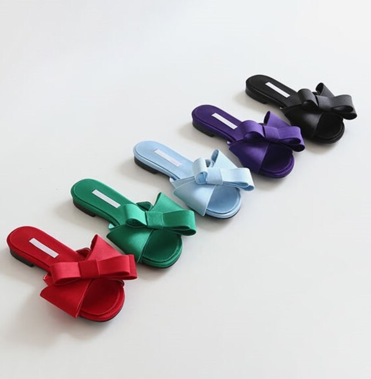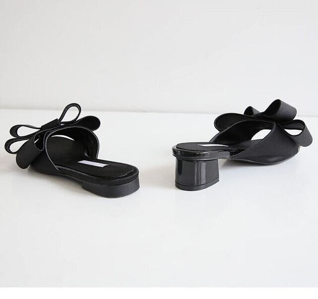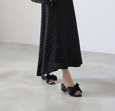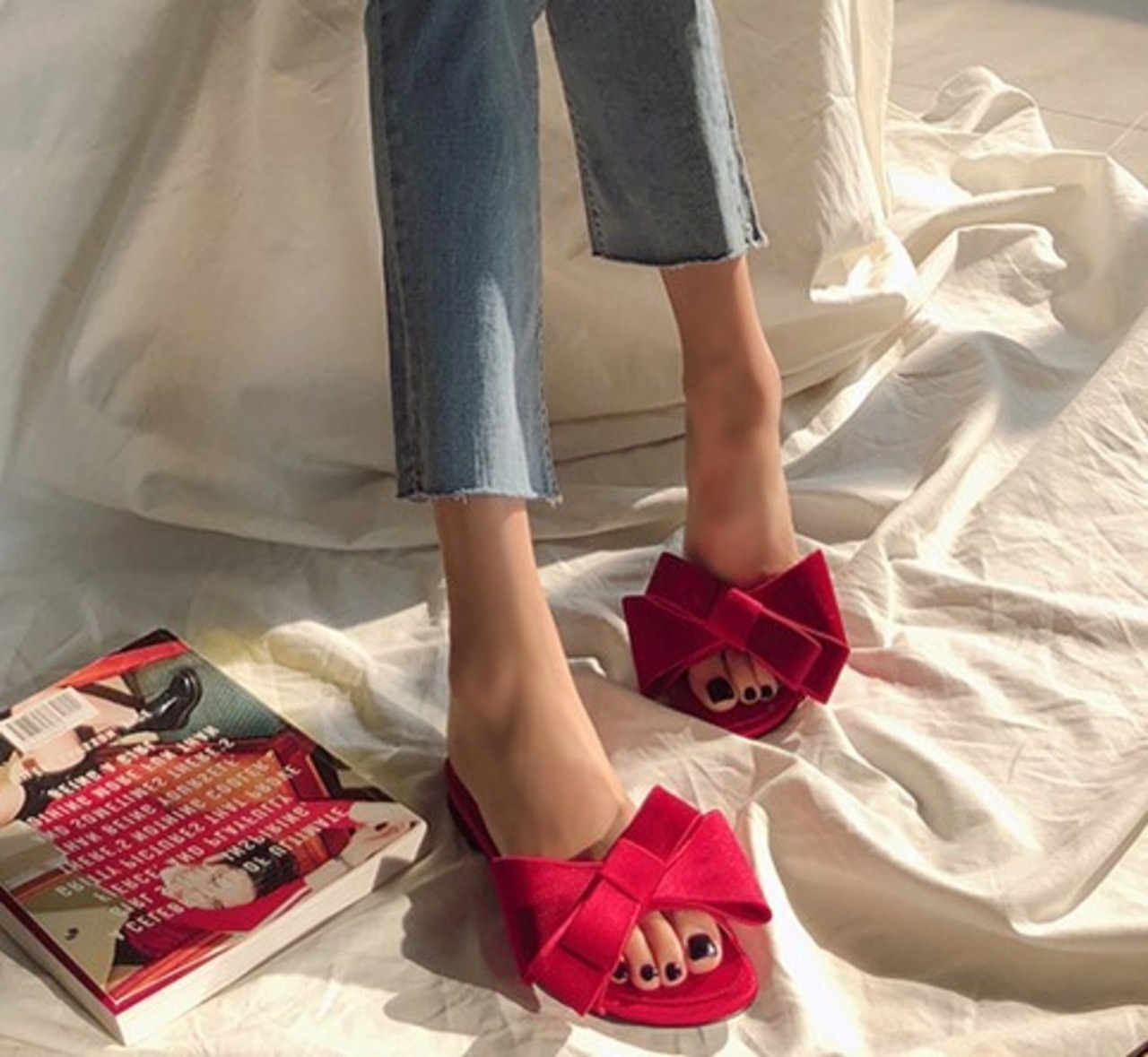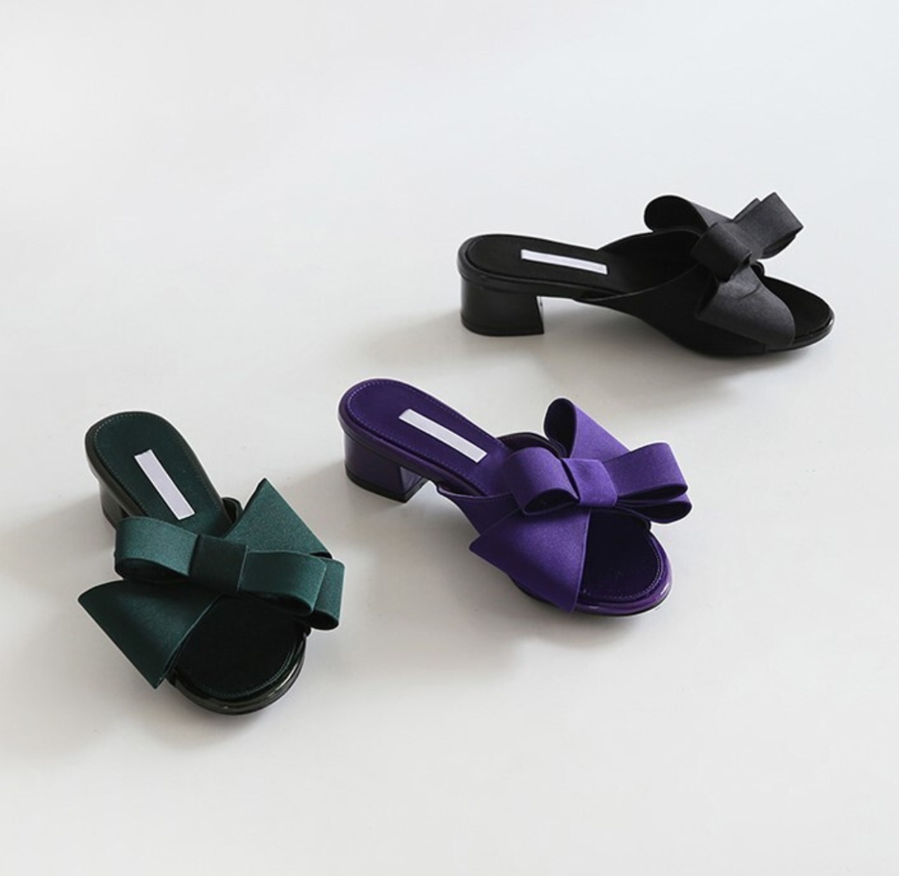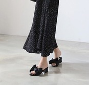 大きなリボンと太いヒールで存在感抜群なサンダルです。
