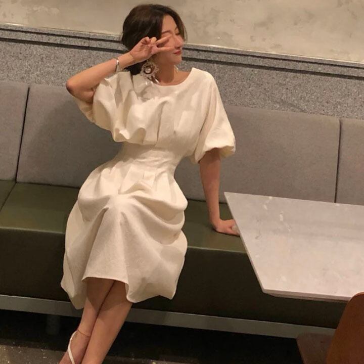 ワンピース フレアワンピース ミモレ ミモレ丈 袖あり 半袖 ボリューム袖 Vネック フレア セミフレア Aライン 大人可愛い きれいめ シンプル 大人 上品 おしゃれ お洒落 大人女子 こなれ感 ラフ エレガント 主役級 存在感 抜け感 春 夏 2022 2023 10代 20代 30代 40代 レディース 女性用 デート お出かけ 女子会 お泊まり 休日 イベント リゾート 旅行 海 ホテル レストラン モテ S M L 白 ホワイト