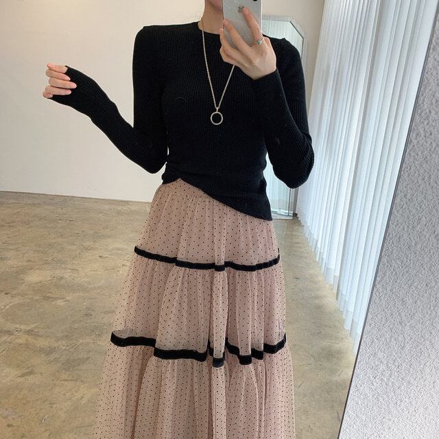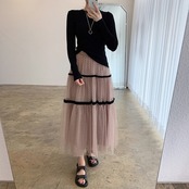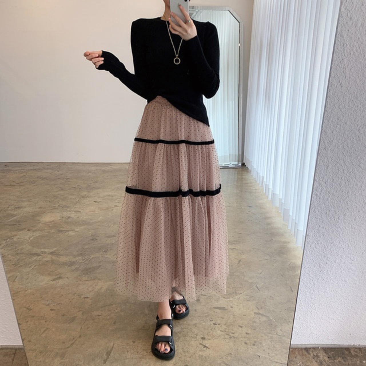 トップス スカート ボトムス カットソー チュールスカート ロング ロング丈 マキシ マキシ丈 袖あり 長袖 ラウンドネック フレア セミフレア Aライン チュール 2点セット ツーピース 上下セット 大人可愛い おしゃれ お洒落 ラブリー キュート ガーリー 無地 ドット柄 春 夏 秋 冬 オールシーズン シーズンレス 2022 2023 10代 20代 30代 レディース 女性用 ママ マタニティ キッズ 女の子 デート お出かけ 休日 楽ちん モテ 体系カバー S M L 黒 ブラック ピンク