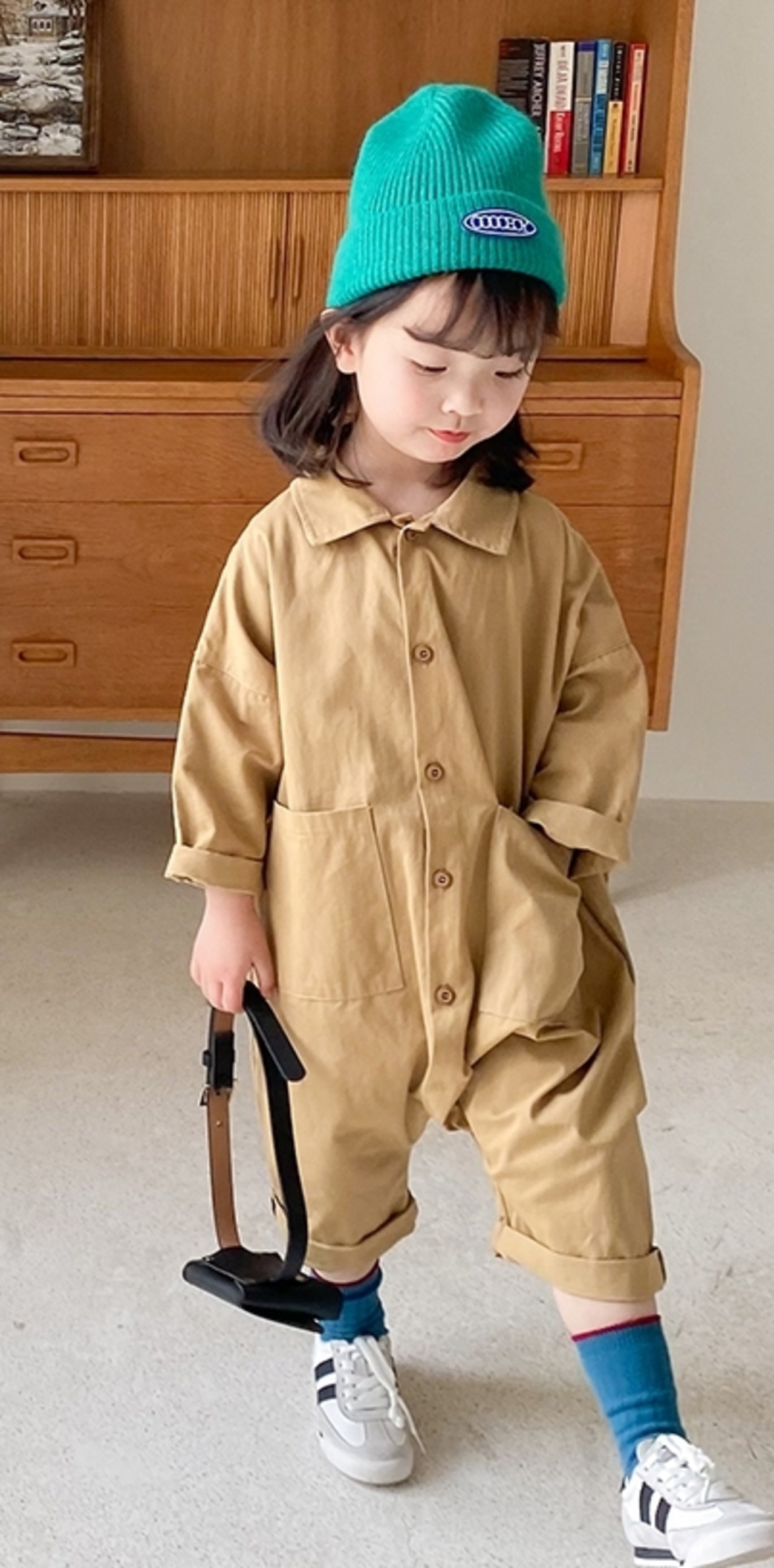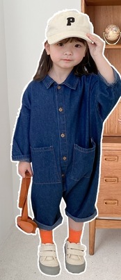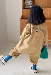 大き目の前ポケットがあるかわいいデザインのカバーオールです。