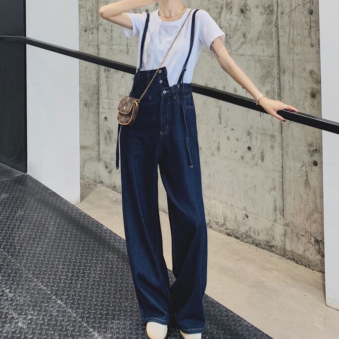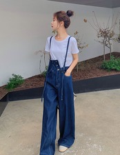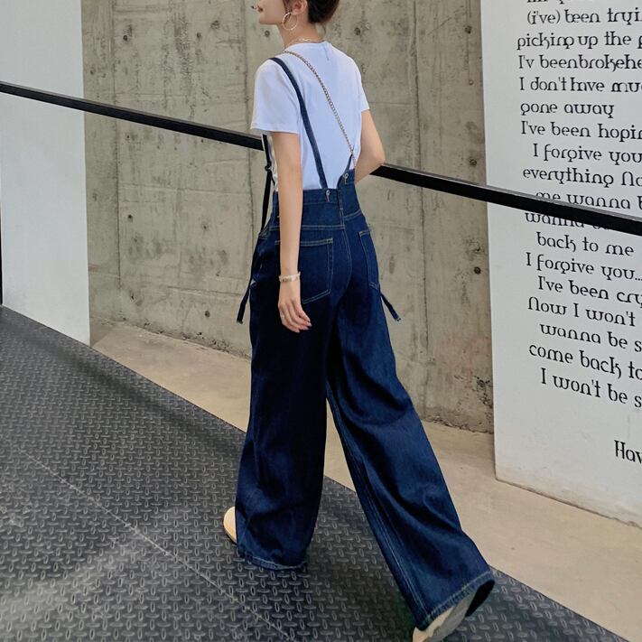 ストラップ細めのサロペットはハイウエスト&ワイドレッグで脚長効果も◎