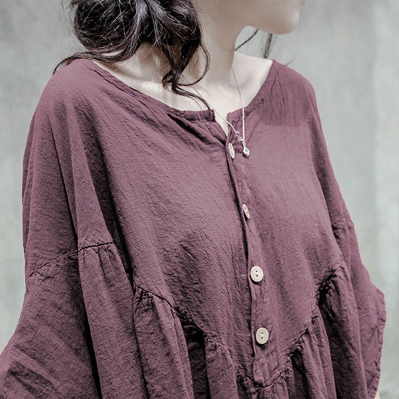 ボディラインをを拾いにくいシルエットですが胸元は立体的な切り替えデザインなので野暮ったく見えません◎