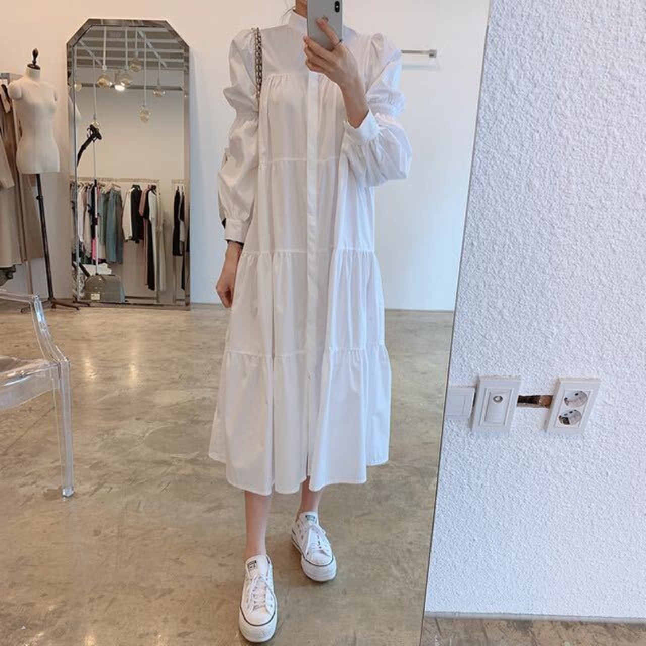 ワンピース ティアードワンピース ロング ロング丈 マキシ マキシ丈 袖あり ボリューム袖 スタンドカラー フレア セミフレア ワイド 大人可愛い きれいめ シンプル カジュアル 大人 上品 おしゃれ お洒落 大人女子 こなれ感 ラフ とろみ感 抜け感 無地 春 夏 秋 10代 20代 30代 40代 50代 60代 レディース 女性用 デート お出かけ 女子会 休日 アウトドア リゾート 旅行 ガーデン 体系カバー フリーサイズ ゆったり ゆる 白 ホワイト 黒 ブラック