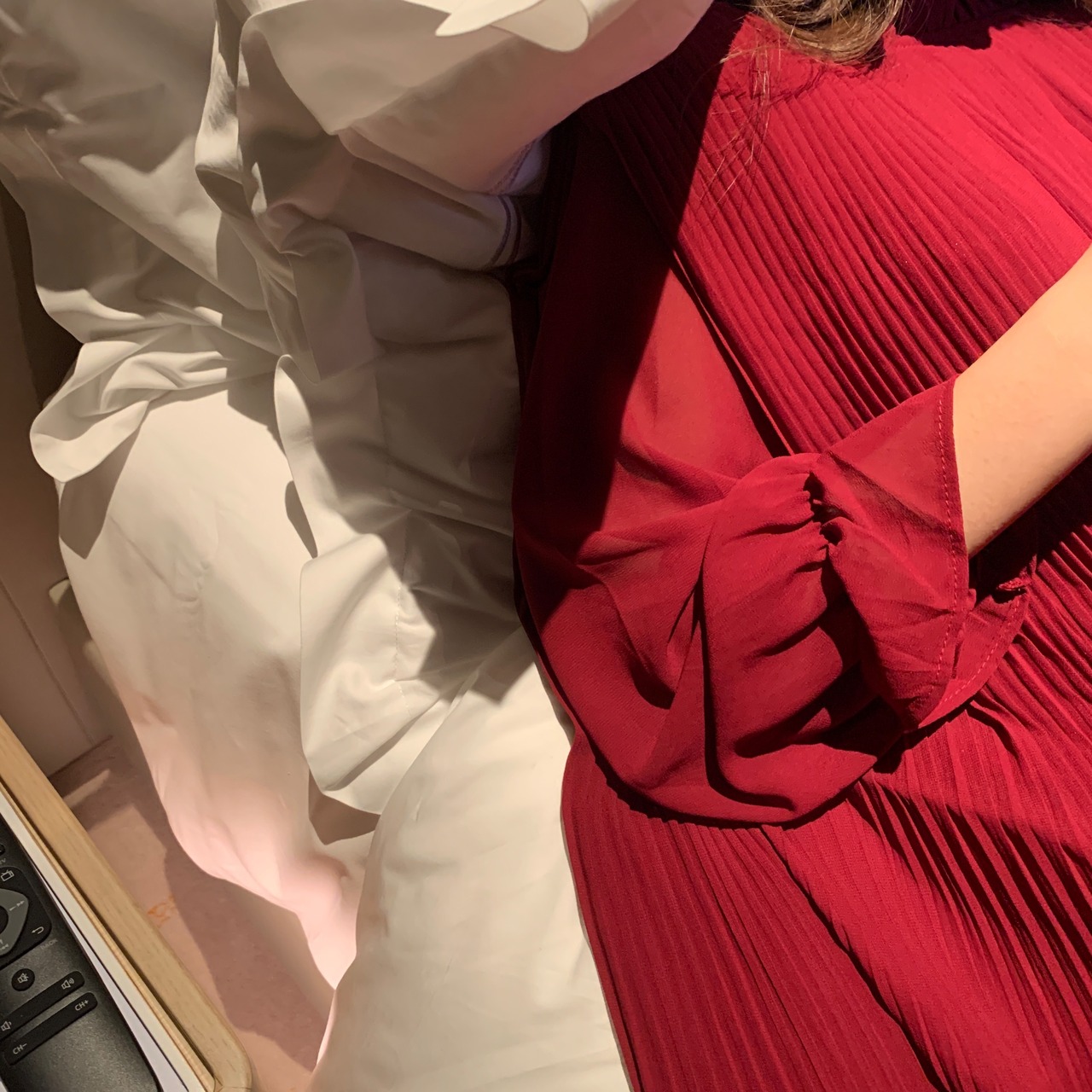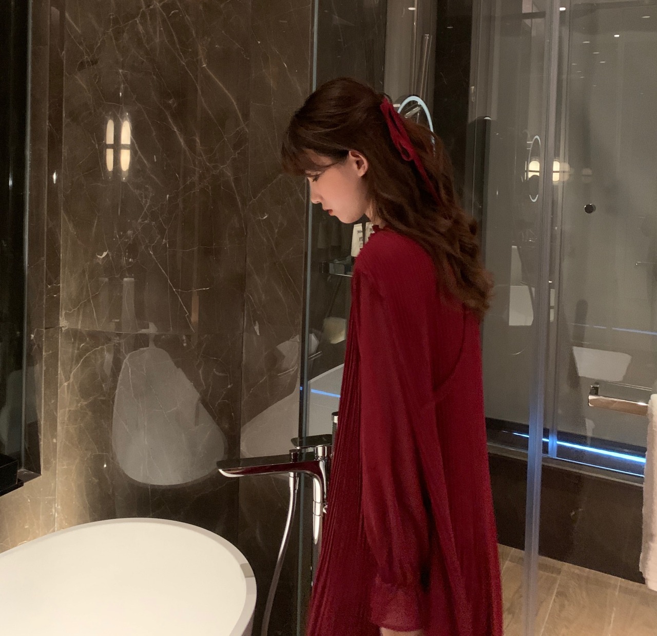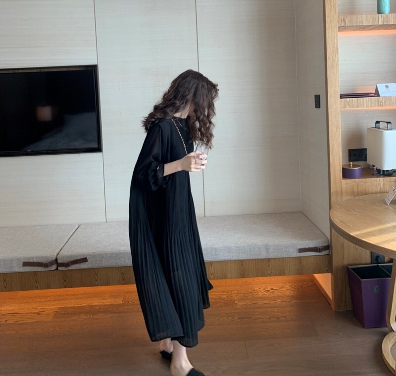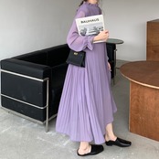 透け感のある布地で裏地付きのプリーツがおしゃれなワンピースです。
